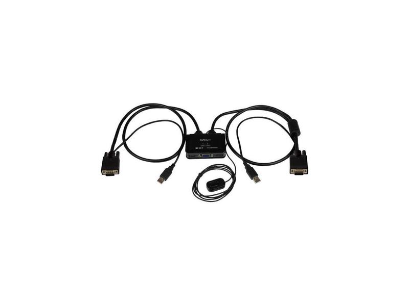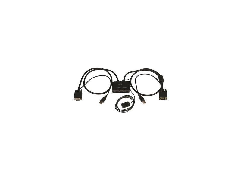 ·The SV211USB 2-Port VGA Cable KVM Switch lets you control two VGA, USB-equipped PCs with a single monitor, keyboard and mouse.To help organize your desk without sacrificing valuable work space, this VGA USB KVM switch features a compact footprint and integrated KVM cables that can be connected directly to your systems. Plus, the KVM is USB-powered, eliminating the need for a bulky external power adapter and wall outlet.This VGA KVM switch offers support for resolutions up to 2048x1536, for the ability to drive a high-resolution VGA display. For simple switching between connected systems, the KVM features a convenient push-button remote switch on a 1.5 meter (5ft) cable, as well as keyboard hot-key support and PC or Mac® compatible switching software.Backed by a StarTech.com 2-year warranty and free lifetime technical support.More from the Manufacturer