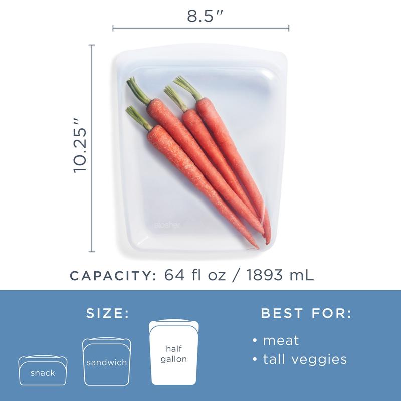 This reusable silicone bag holds two strip steaks, making it ideal for sous vide. It also stores leafy greens and veggies perfectly, and can actually extend the life of them when stored in a Stasher. Dimensions: 8.5 x 10.25 x 1.5 in (21.6 x 26 x 3.8 cm). Volume: 64 fl oz. (1893 mL). Tare weight: 4.2 oz. (119 gm).