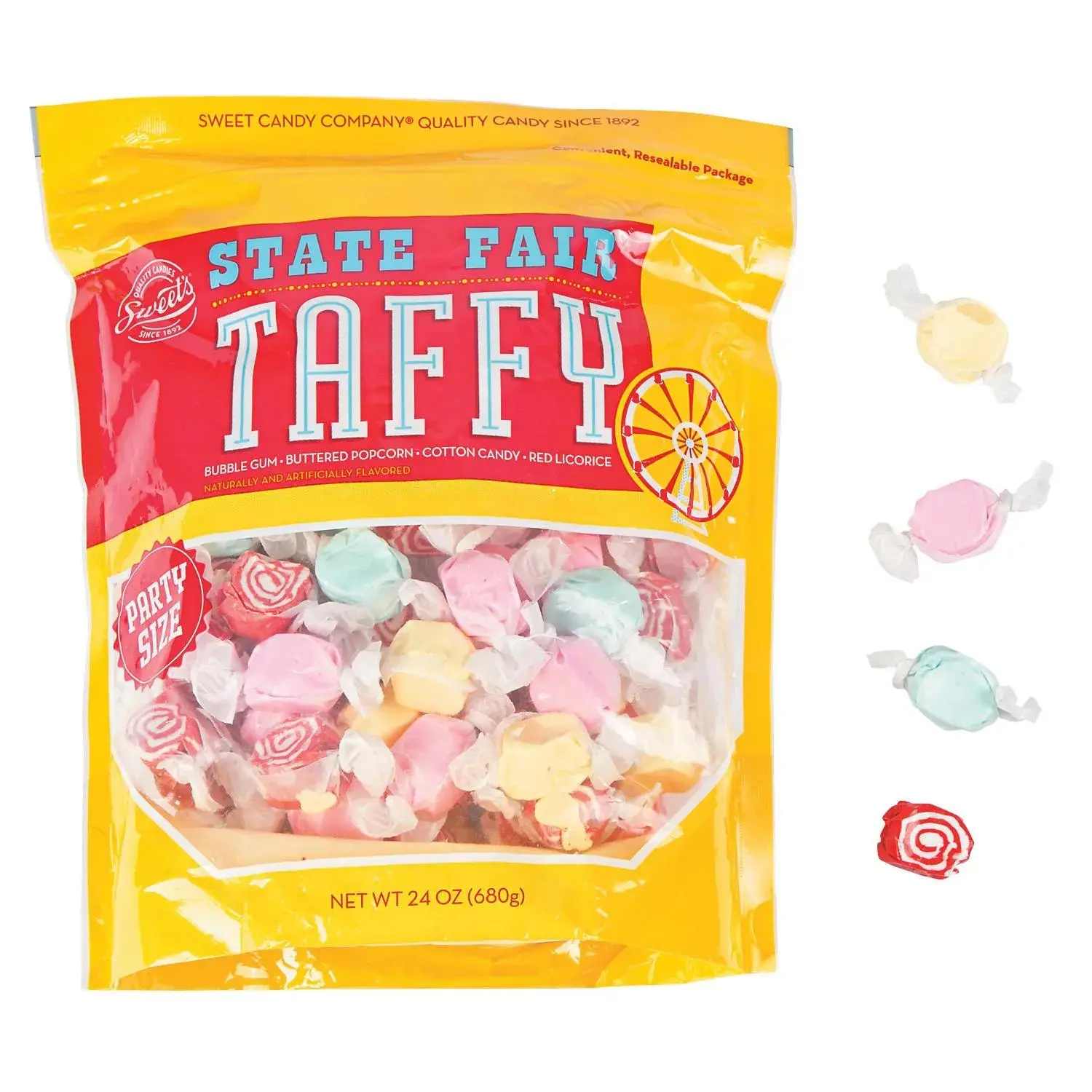 Salt water taffy is everyone's favorite! This sweet treat is great for school carnivals, Easter egg hunts, birthday party favor bags and more. Chew on this - the large assortment of flavors will keep everyone happy! This classic, delicious candy is an old-fashioned tradition that brings back memories of trips to the seaside and is beloved by people of all ages. Includes bubble gum, cotton candy, buttered popcorn and red licorice flavors. Individually wrapped. (Approx. 112 pcs. per unit) Total wt., 1 lb. 8 oz.