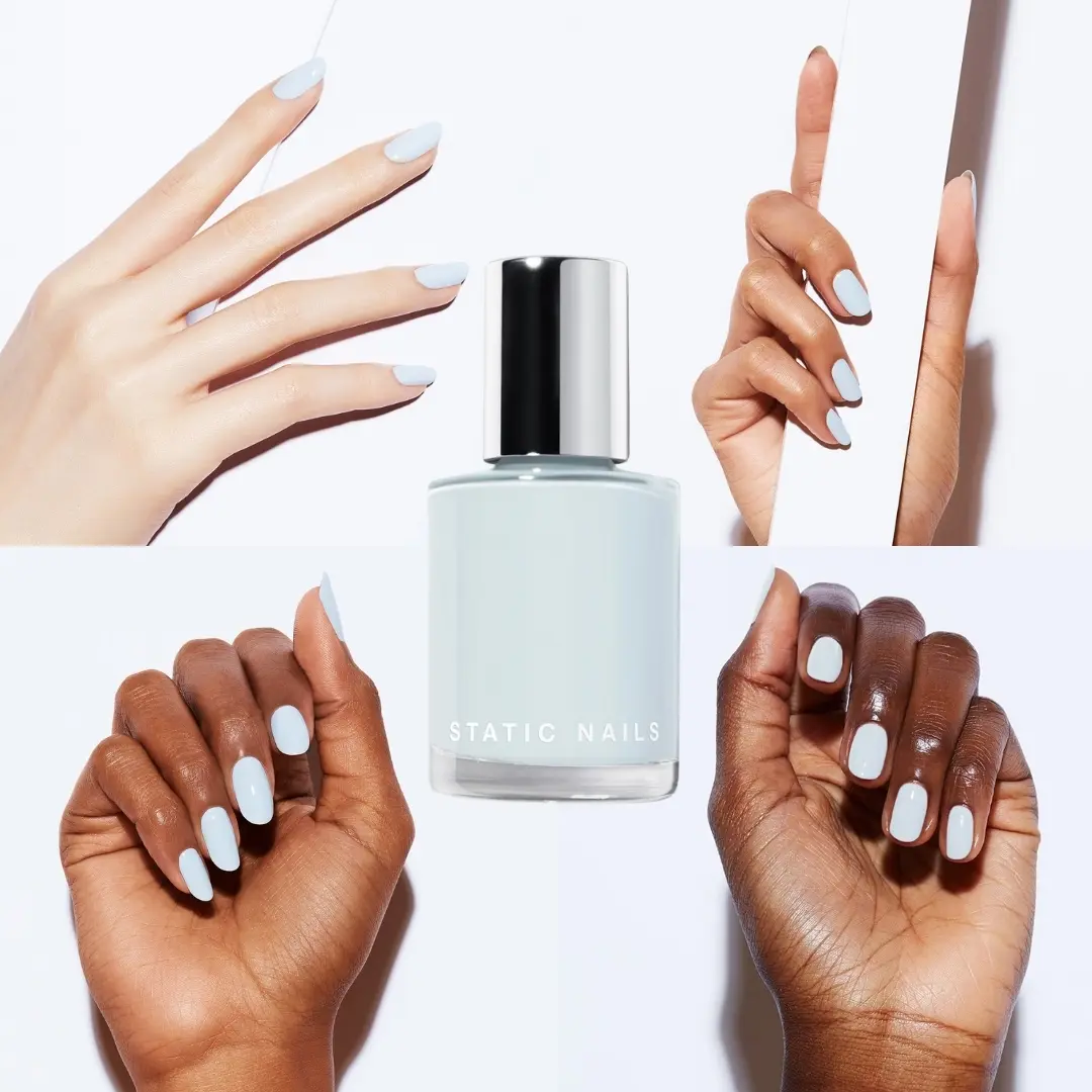 Livin In A Dream: Soft neon blue with warm sky undertones. This buildable formula will be semi-sheer if worn alone, or, full coverage if two coats of Elixir (our pure white lacquer color) is applied prior. Applying Elixir will also make the color more vivid as shown in the on-model swatch photos.