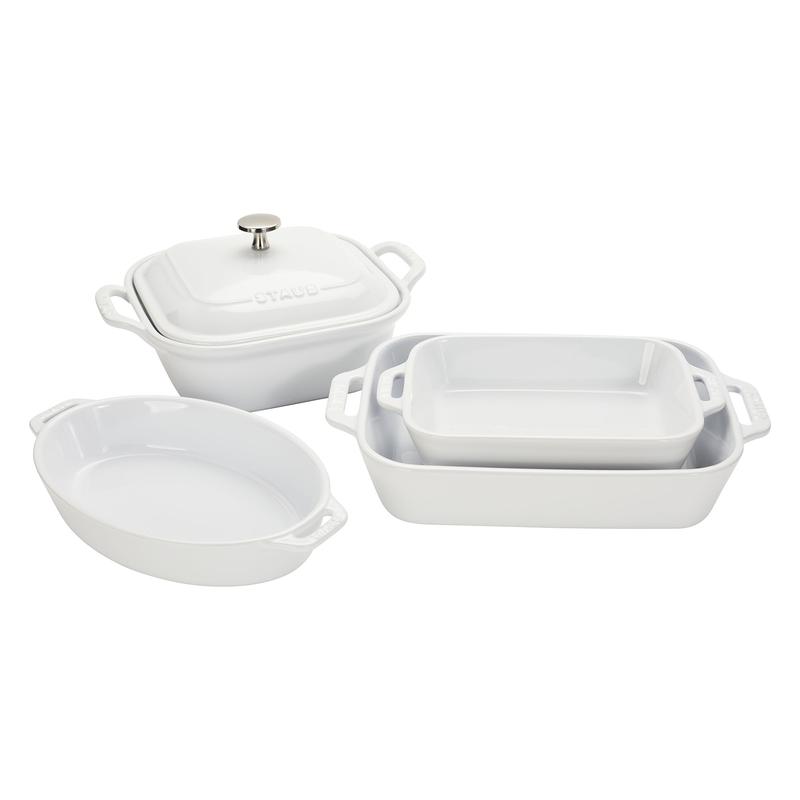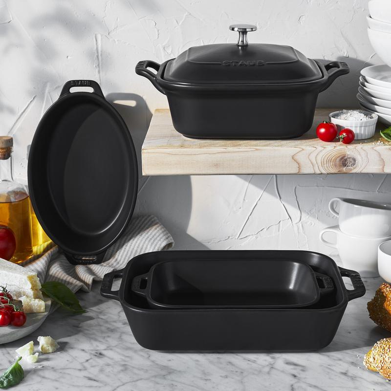 With this STAUB 5-piece baking dish set, the baking possibilities are endless. Enjoy gooey mac n' cheese, perfectly layered lasagnas, and moist brownies every time. With STAUB bakeware, you can enjoy delicious homemade meals that also look beautiful on the tabletop.