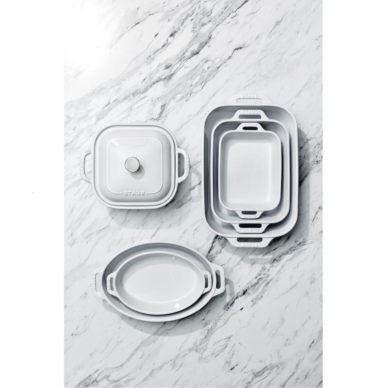 The elegance and functionality of STAUB ceramics goes from freezer to oven to table. The glass porcelain finish matches all STAUB cast iron to mix perfectly at the table. Oven and broiler safe up to 570°F, ceramics can also be used in the microwave and are dishwasher safe, as well as highly scratch, impact, and thermal shock resistant.