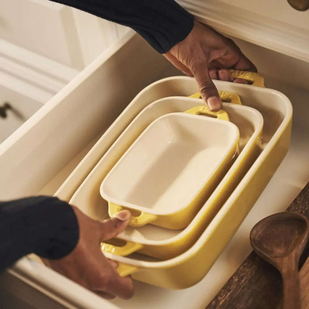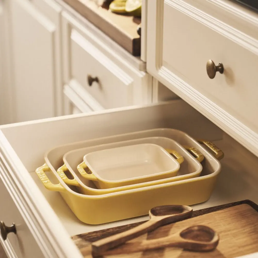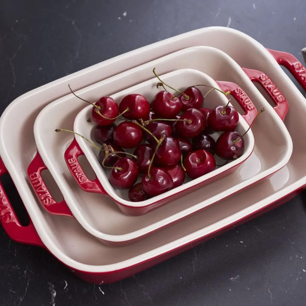 Kit out your kitchen with the Staub 3-Piece Rectangular Baking Dish Set, crafted from enameled ceramic stoneware used by renowned chefs and restaurants around the world. Ideal for all your baking and roasting needs, this set features a vitreous glass porcelain-enamel finish that retains heat effectively and won’t absorb moisture, ensuring consistently delicious results. From easy weeknight dinners for one to gratins, casseroles, and even a traditional tiramisu for the whole family, this set is perfect for a variety of recipes.