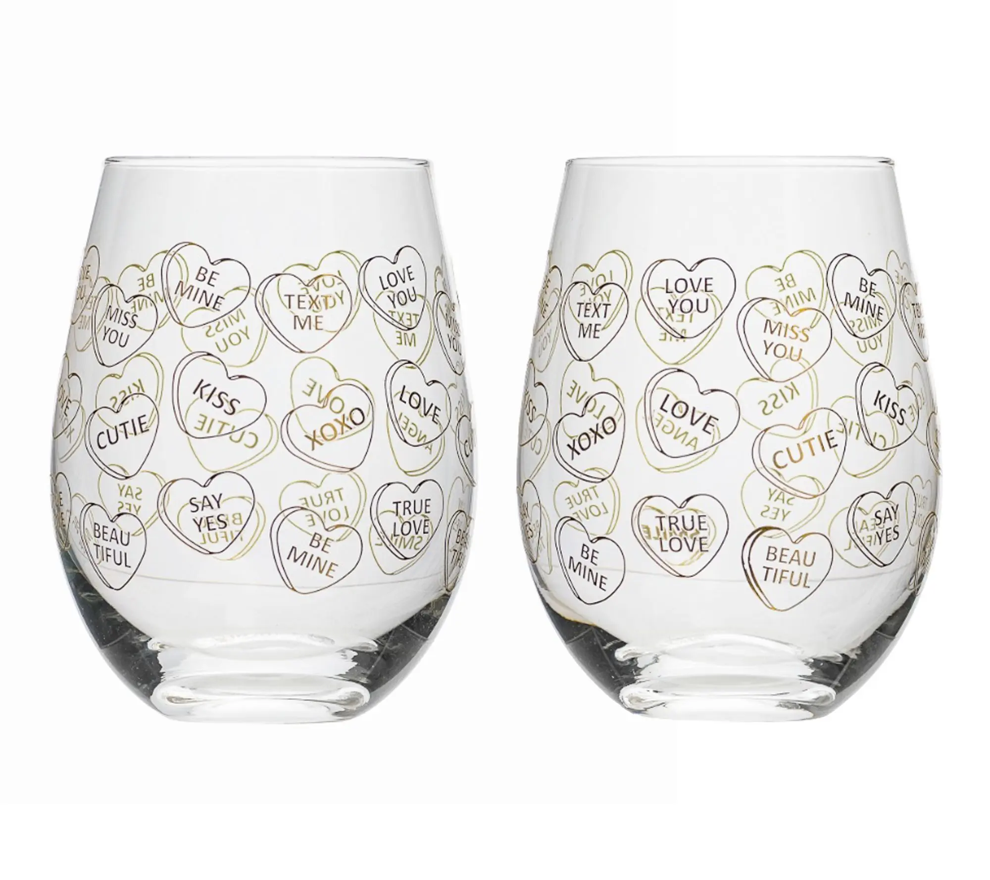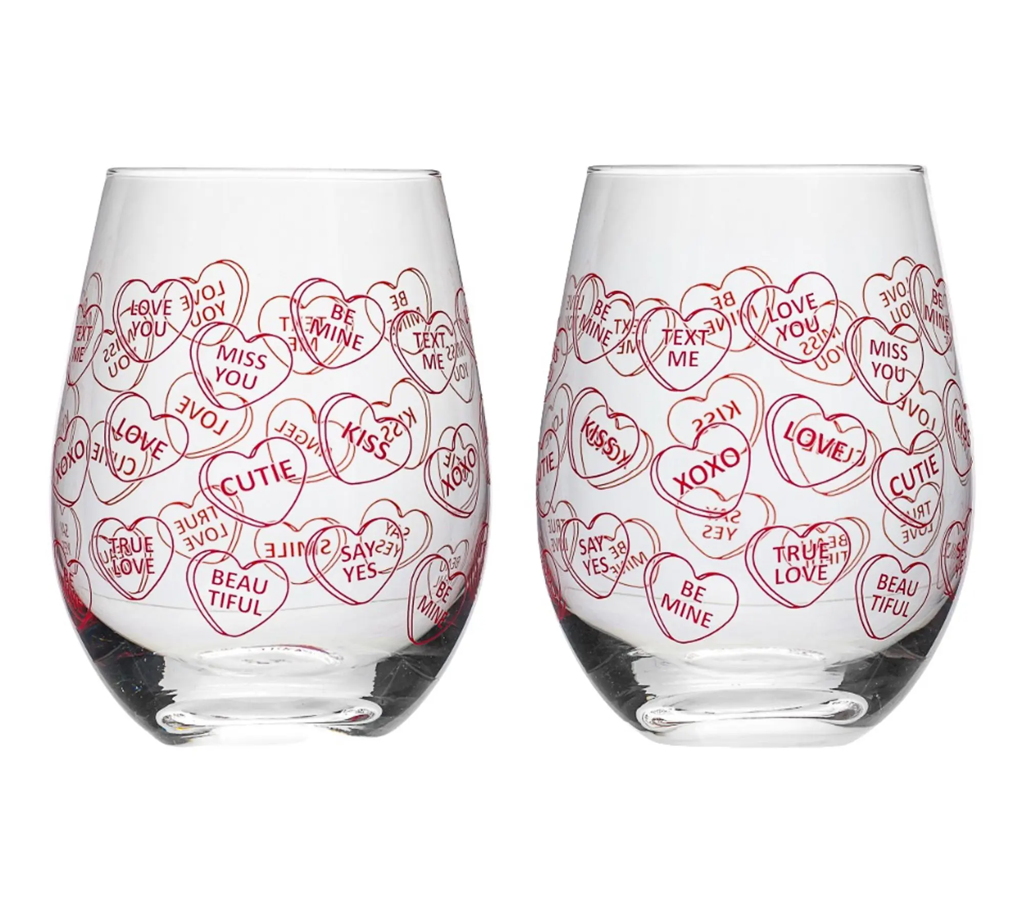 Add a festive touch to your next celebration with this set of stemless wine glasses, featuring playful candy heart designs that bring cheerful, love-filled charm to any table. Whether you're toasting with a loved one or gifting as a sweet surprise, these glasses make every sip feel special and memorable. From 10 Strawberry Street.