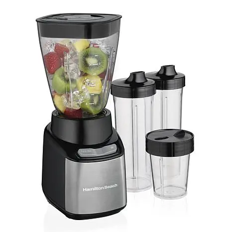 Hamilton Beach® Stay or Go Blender Combining the practicality of a full-size blender with the convenience of a single-serve, the Stay or Go Blender fits your busy lifestyle. It can easily make smoothies or shakes and can also puree sauces or grind hard cheeses. With four containers included, this blender is the perfect size for every job.  What You Get 32 oz. Jar (2) 16 oz. Travel cups with drinking lids 8 oz. cup Shaker lid 3-year limited warranty