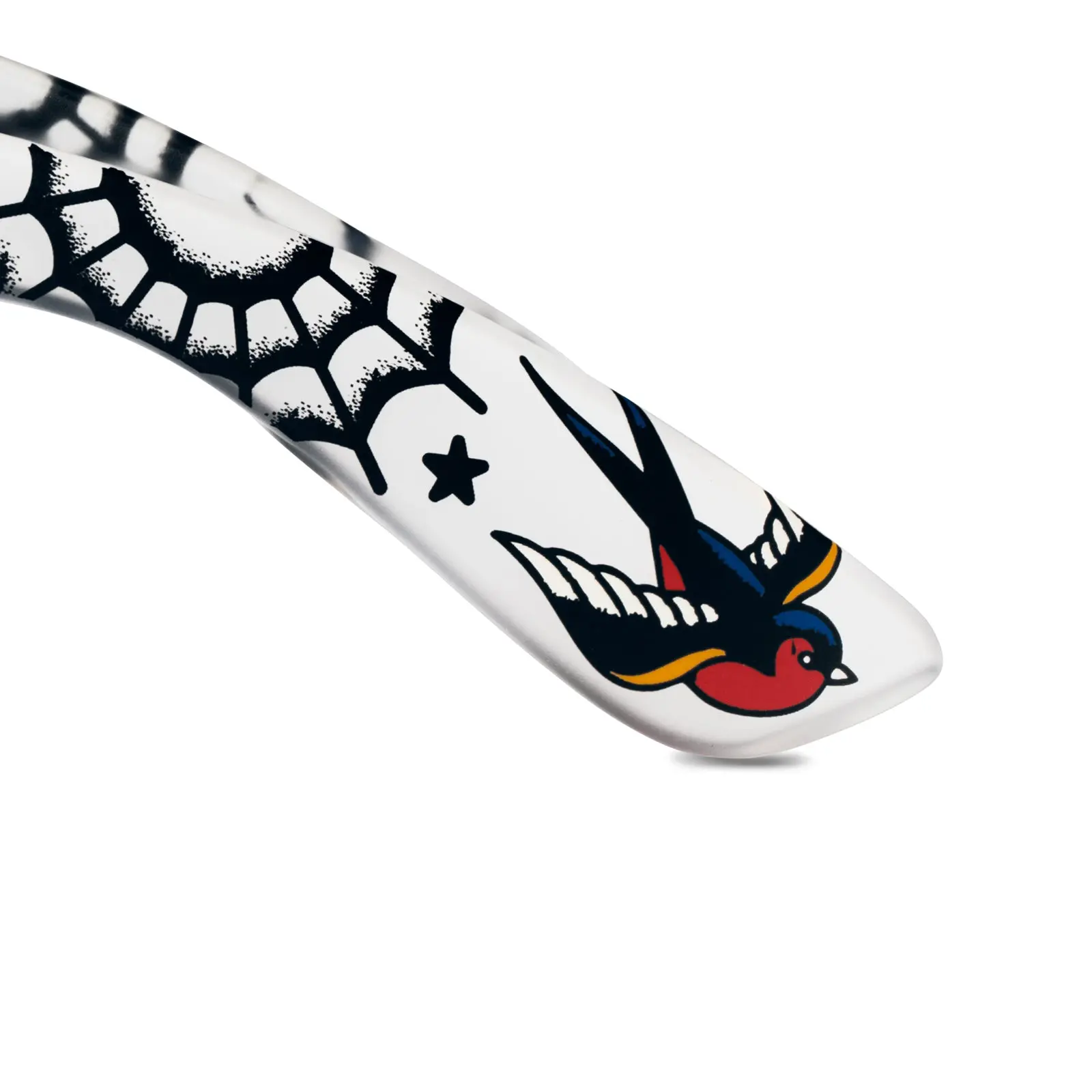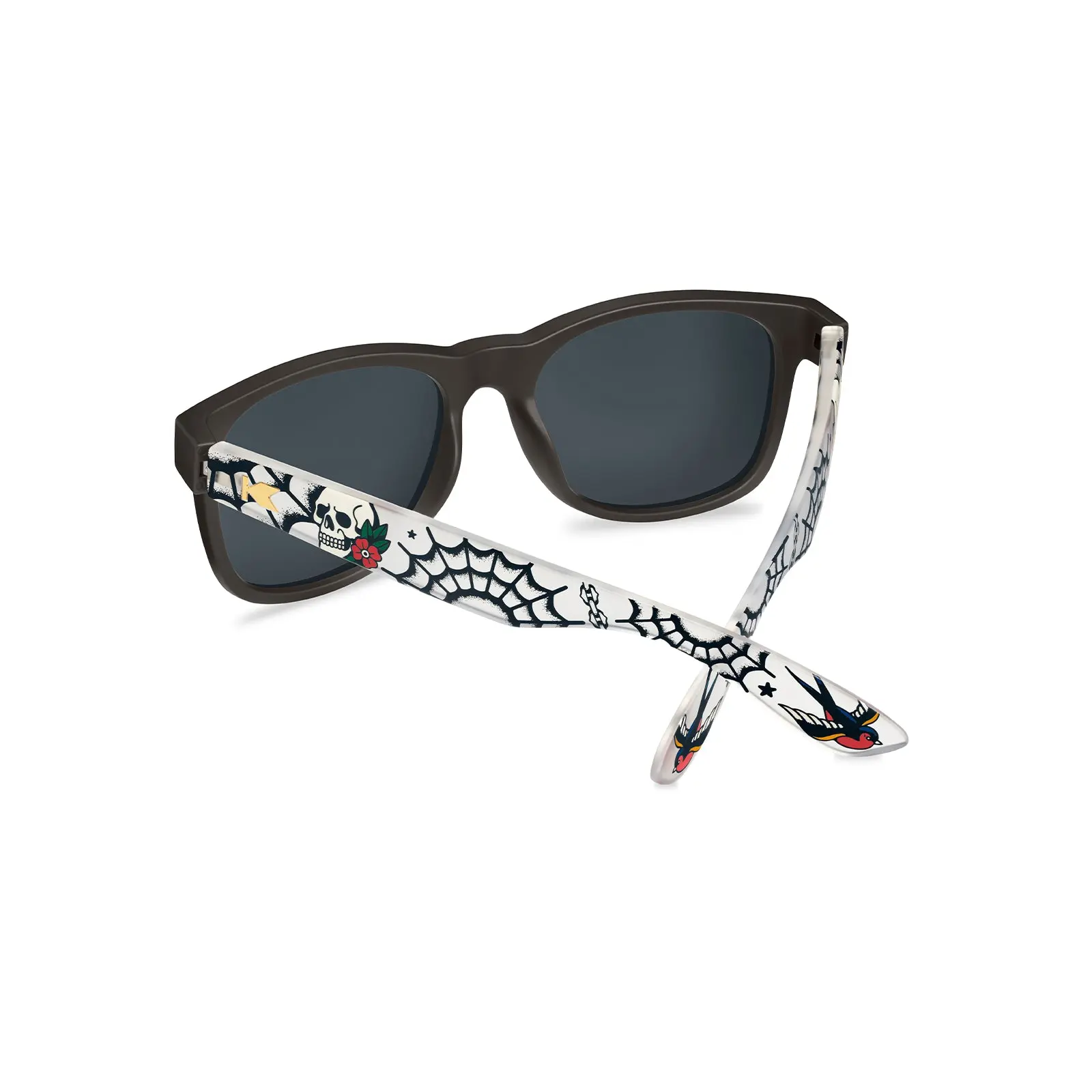 The Steady Hand Fort Knocks pay tribute to an original American art form. The frames feature a spiderweb texture with gold K logos, while the arms are covered in hand-drawn flash art: skulls, swallows, roses, and more. Polarized gold mirror lenses and metal spring hinges finish the look. Comes with a custom old school pouch.