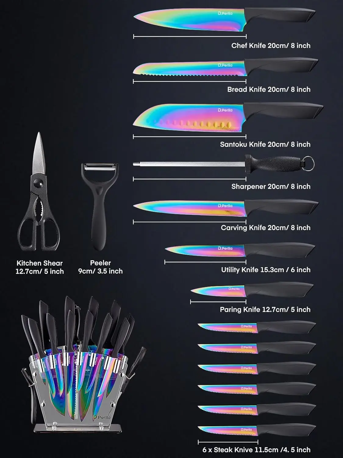 ·Value Kitchen Knife Set: The fantastic knife set includes 8" chef knife, 8" carving knife, 8" bread knife, 6" santoku knife, 5" utility knife, 3.5" paring knife, 6 x 4.5”steak knives, 3.5" peeler and 5" scissors, 8" sharpening steel and an acrylic stand, which cover all cutting needs in the kitchen, from vegetable through to meat cutting