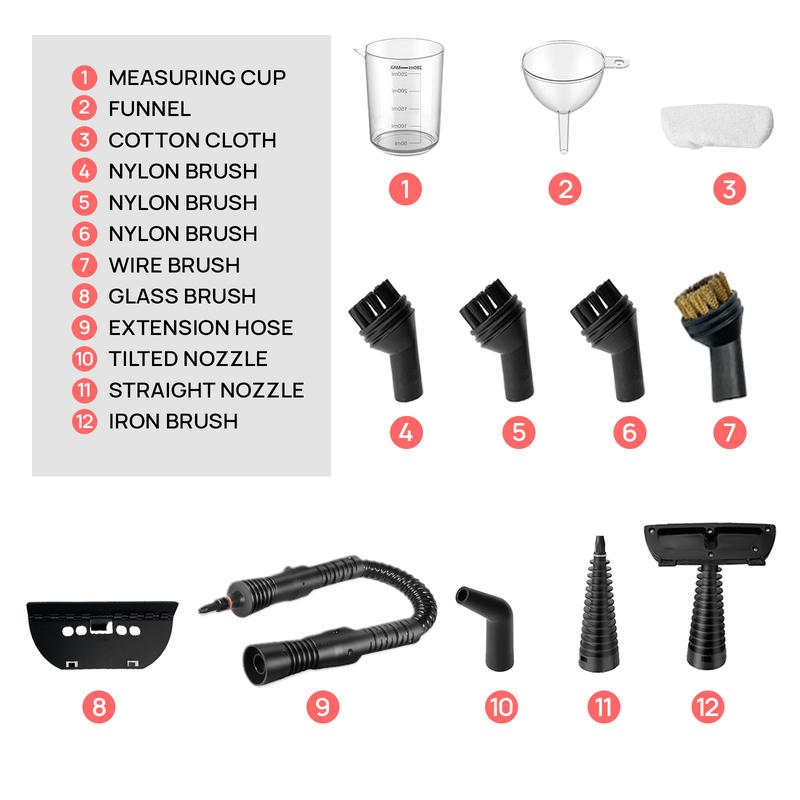 12-Piece Accessory Kit: Includes 4 round brushes and other attachments for various cleaning needs.