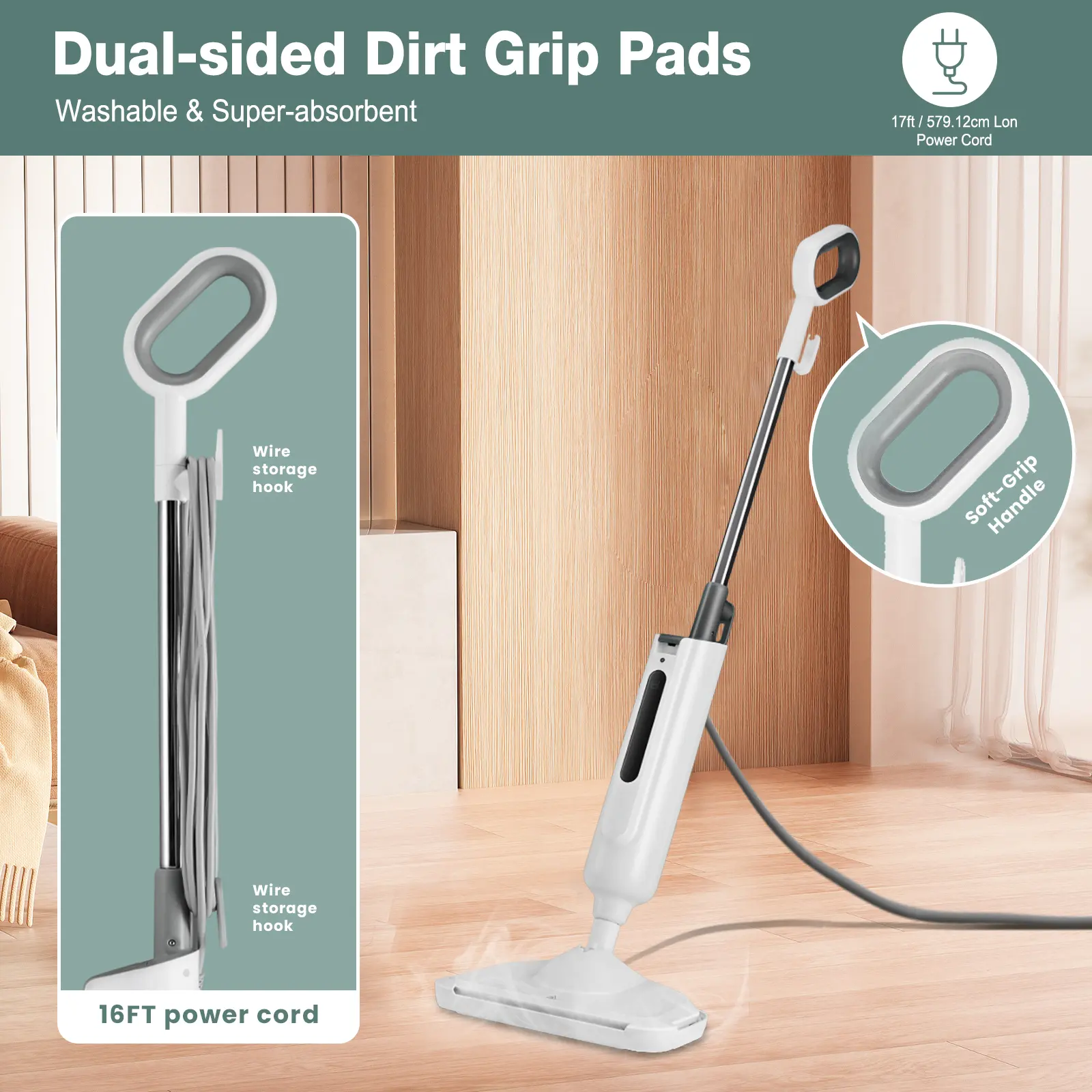 【Flexible & Agile】Our steam mop comes with a 16.4ft power cord and swivel mop head for maximum coverage, effortlessly cleaning every corner, even under sofas and tables.