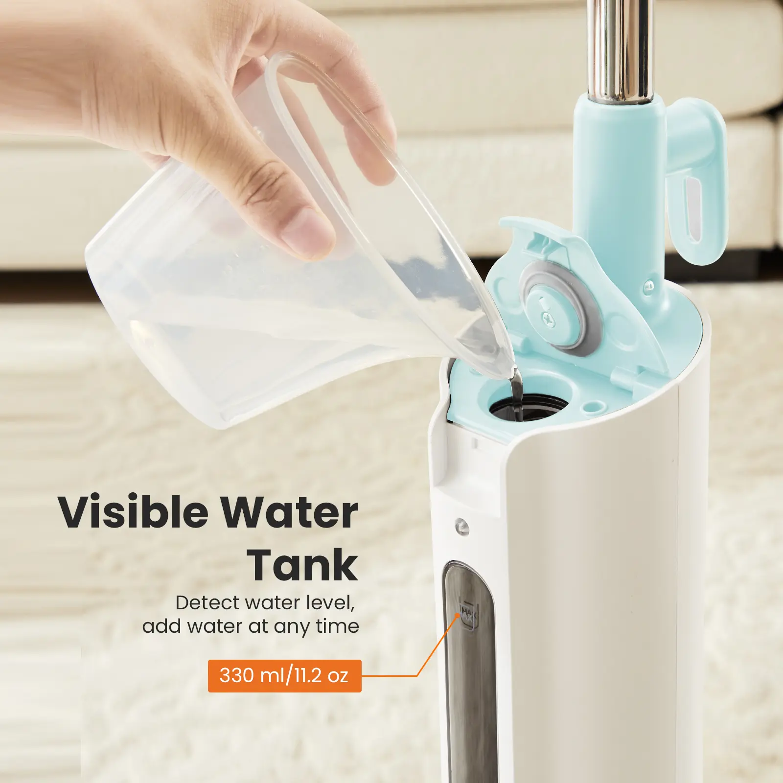 【11.2oz Visible Water Tank】 The water tank with a 11.2oz capacity allows for easy monitoring, and the included measuring cup ensures convenient refills, making cleaning a breeze.