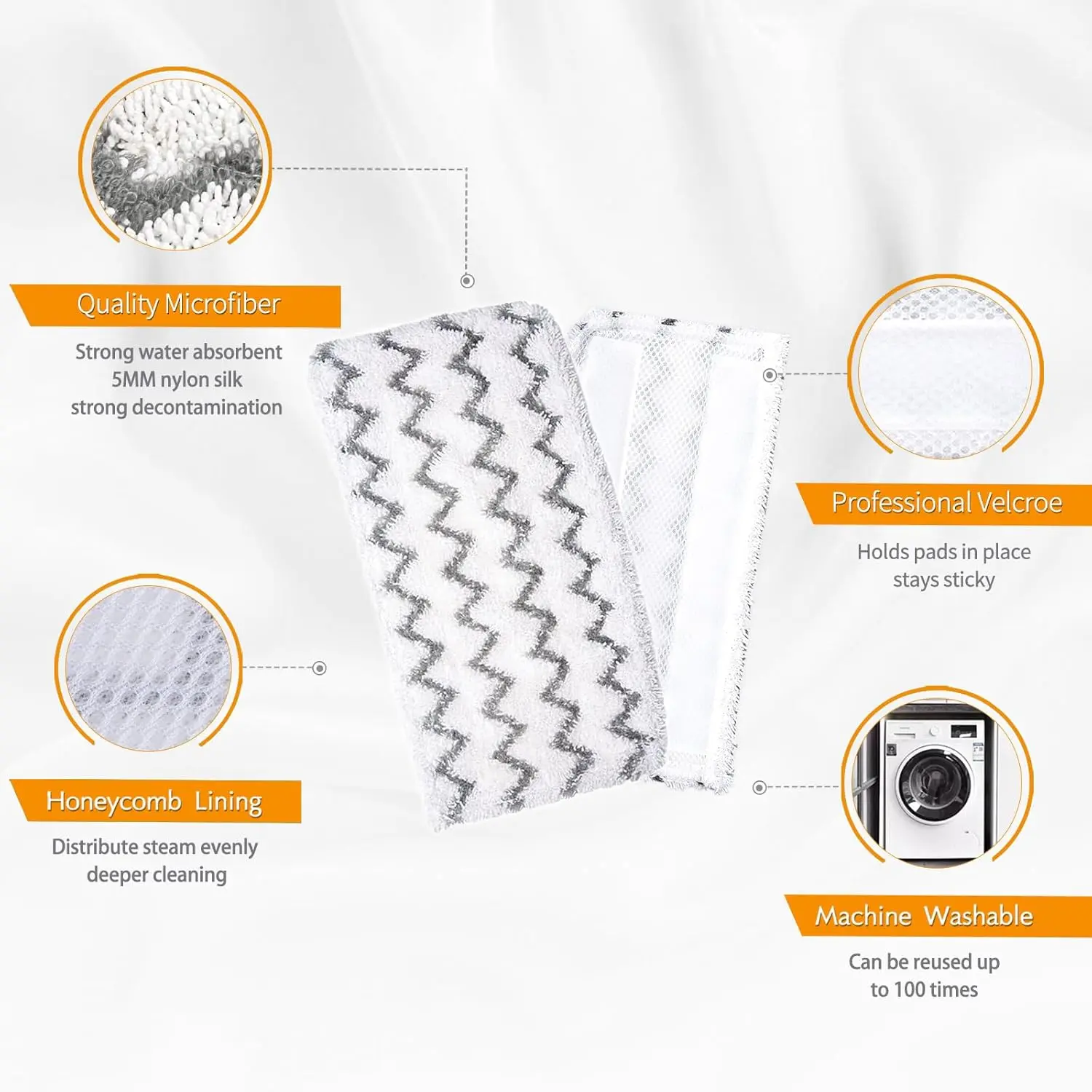 Quality Mop Pads:High density microfiber. Three layer sandwich mesh lining design, easy to release steam, will not scratch or smear the floor surface. water absorption and quick drying