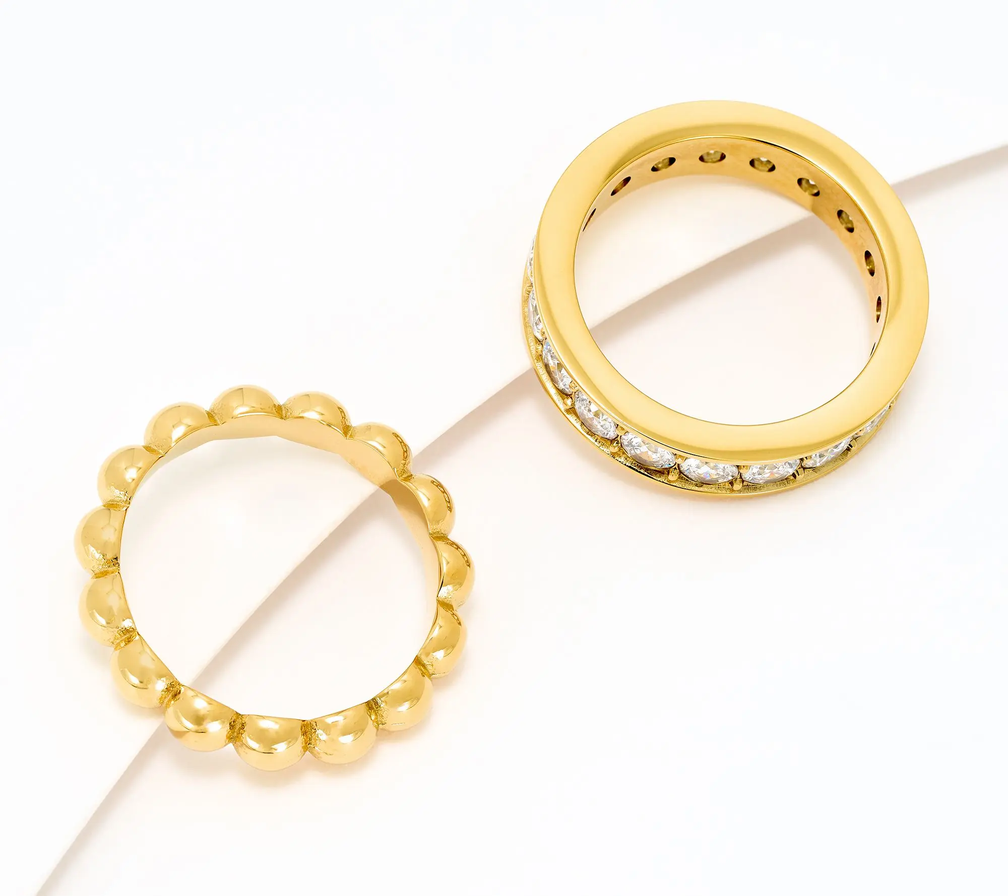 Steel by Diamonique Set of 2 Band Rings stainless steel, silvertone, goldtone Plating. Polished band ring, eternity ring with round white CZ, DE cttw: 2.21 - 2.29 Ring sizes: 4, 5, 6, 7, 8, 9, 10 ,11 Measures: 3/16" * 1/8", 3/16" * 1/8" Actual CZ weight: 3.74 - 5.06 Imported