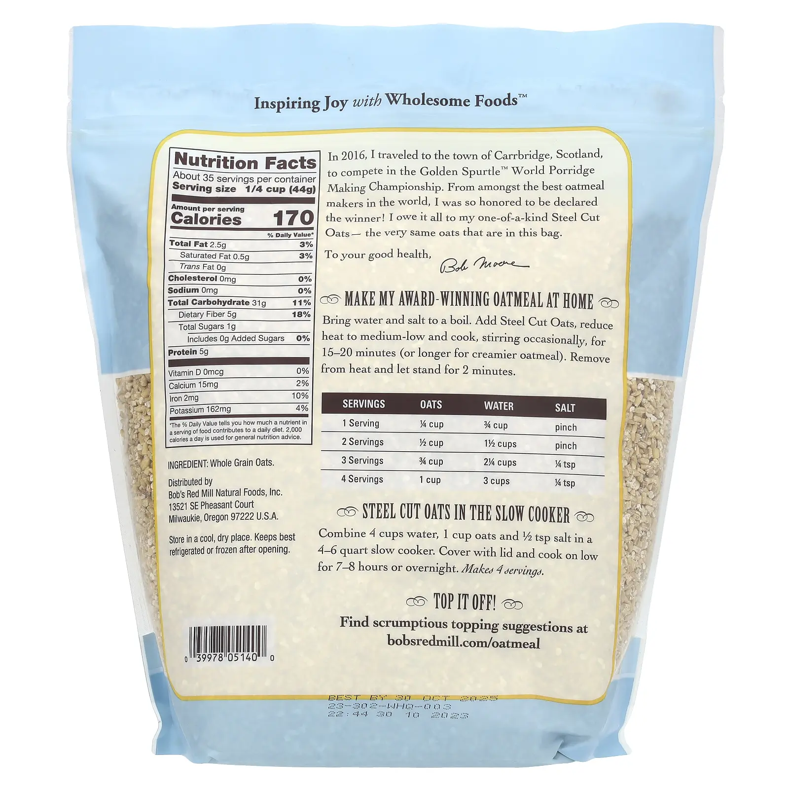 Bob’s steel cut oats are the best. I have been using these from so long . Ordered multiple times from this seller . Delivery is quick.