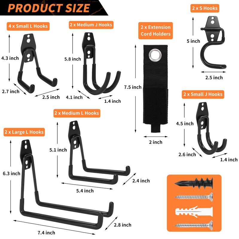 Elevate your garage organization with our Steel Heavy Duty Storage Hooks. This bundle includes various hooks designed for efficient storage. The hooks feature an anti-slip coating for added safety and stability. Perfect for hanging tools, equipment, or supplies, they ensure your items are neatly arranged. Anchors and screws are included for secure wall mounting.