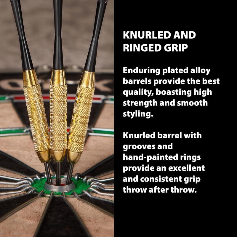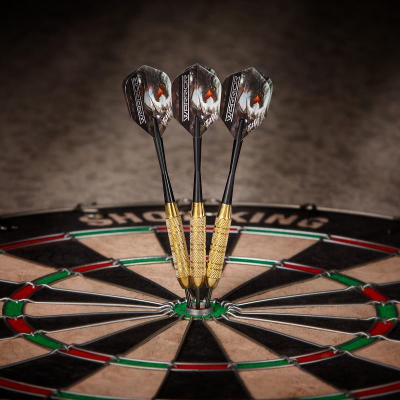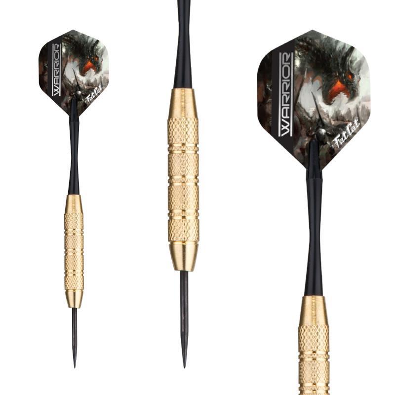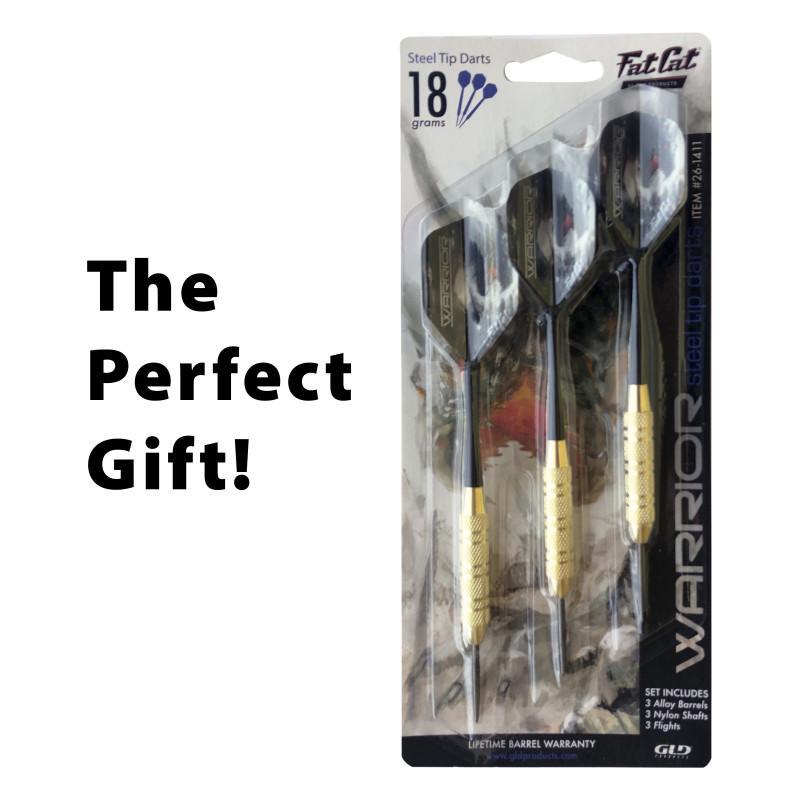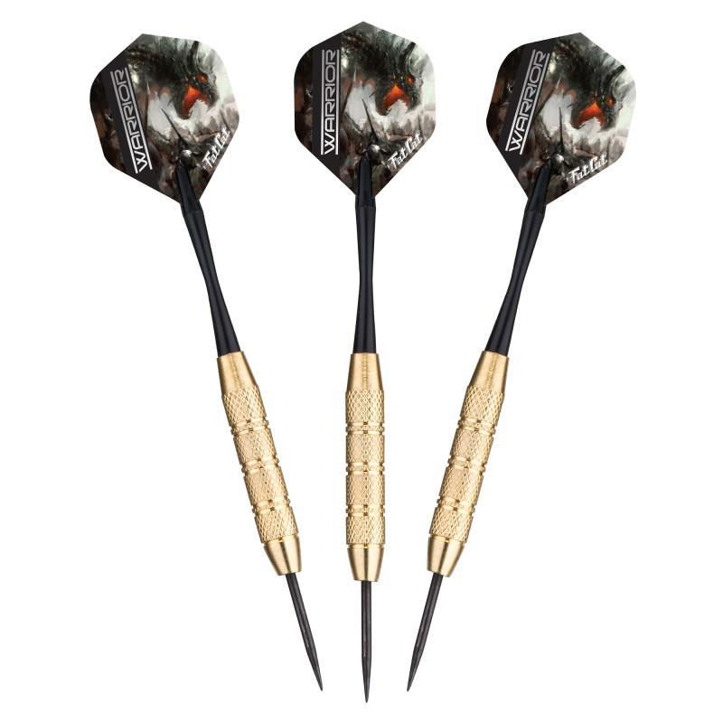 Step up your game with the Fat Cat Warrior Steel Tip Darts designed for sisal dartboards. These darts are great due to their durable and low cost design. These barrels have heavy knurling along their length for a solid grip anywhere you hold it. They also feature tough nylon shafts built to last. To top it off, each set is adorned with wide dart flights that are finished with unique Warrior graphics. This steel tip dart set comes with three fully assembled darts.