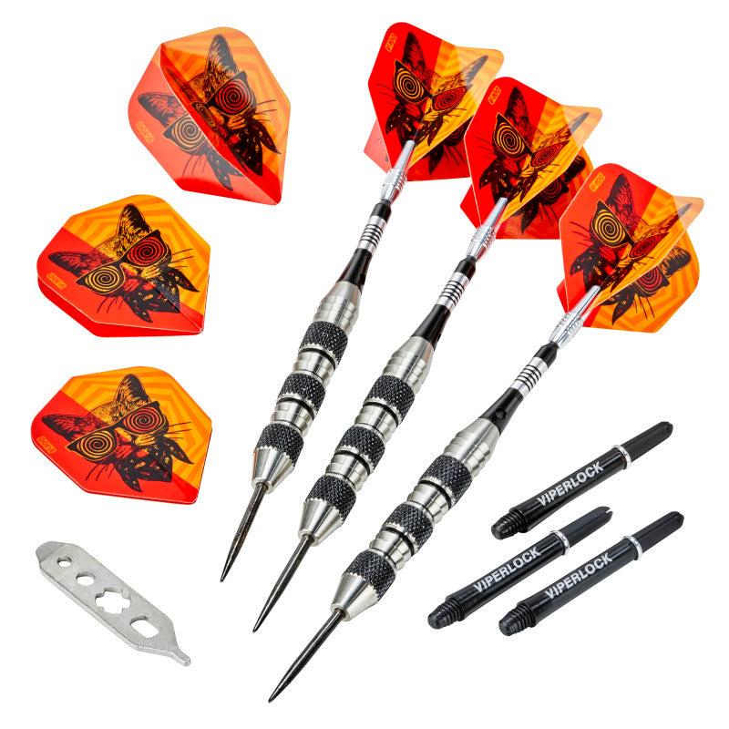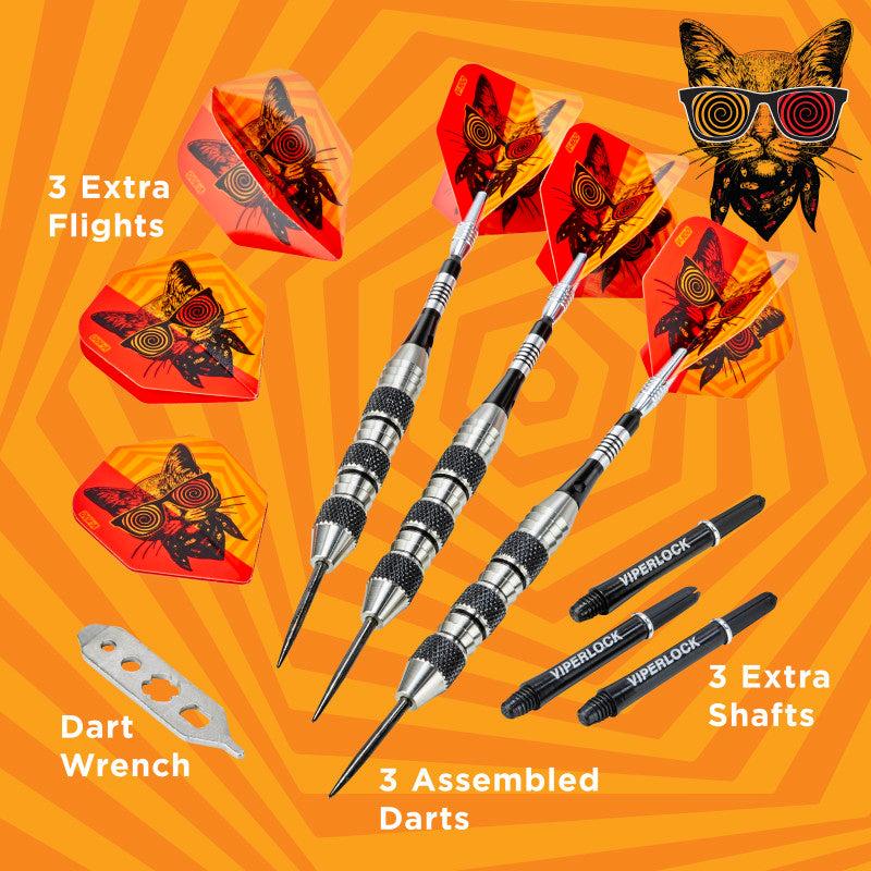 Get into your opponent’s head and let you weird side out with the Viper Freak Steel Tip Darts designed for use with sisal dart boards. These darts are packed with features starting with the barrel, fashioned from nickel silver alloy. Constructing the darts in this fashion allows us to bring you tough, weighted barrels without breaking the bank. Nickel silver is an alloy that has been used in construction for its durability and great looking style, while maintain a lower cost. We use this alloy to provide the highest quality barrels at the best costs to you. Each barrel enjoys hand painted rings, heavily knurled bands and ridgeback fins, allowing your grip to remain consistent throw after throw. Included in this package is a tip shaping stone. After tons of throws, your dart tips can accrue burrs and imperfections, the shaping stone helps to correct them and get you back to throwing in no time. The Freak Darts feature tough, lightweight Convex Nylon Shafts. Finally, each dart is finished off with the Freak graphics adorning each flight, for an eccentric look. Each set includes three extra flights, three extra nylon shafts, a dart mechanic repair tool and a slim case.