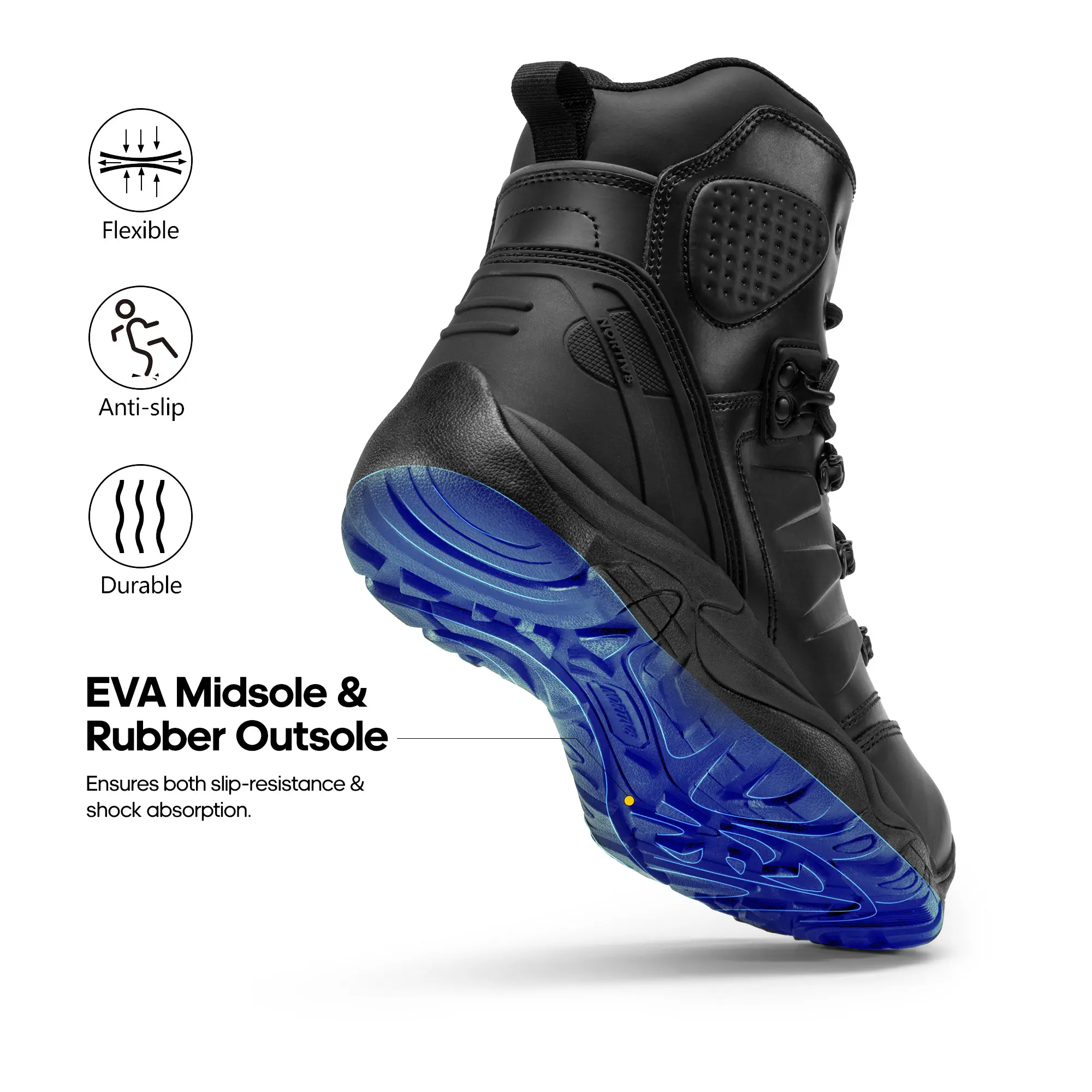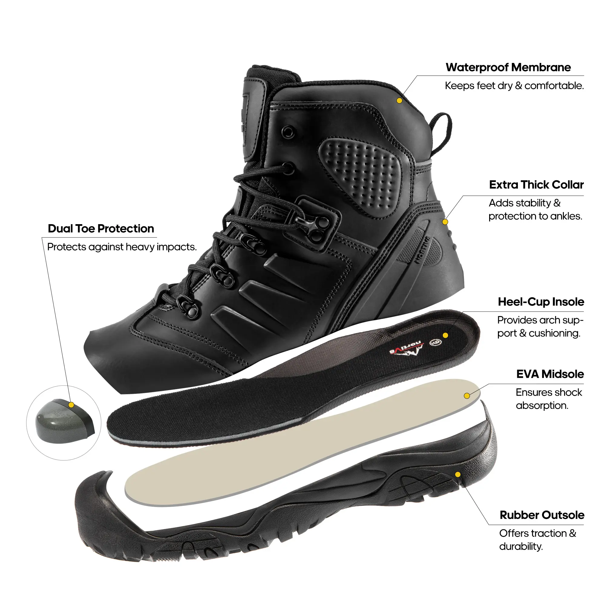 Rubber Outsole & EVA Midsole: Offering superior grip for safety and shock absorption for fatigue relief, these industrial cap toe work boots allow workers to tackle their tasks with confidence and efficiency, ensuring optimal performance throughout the day.