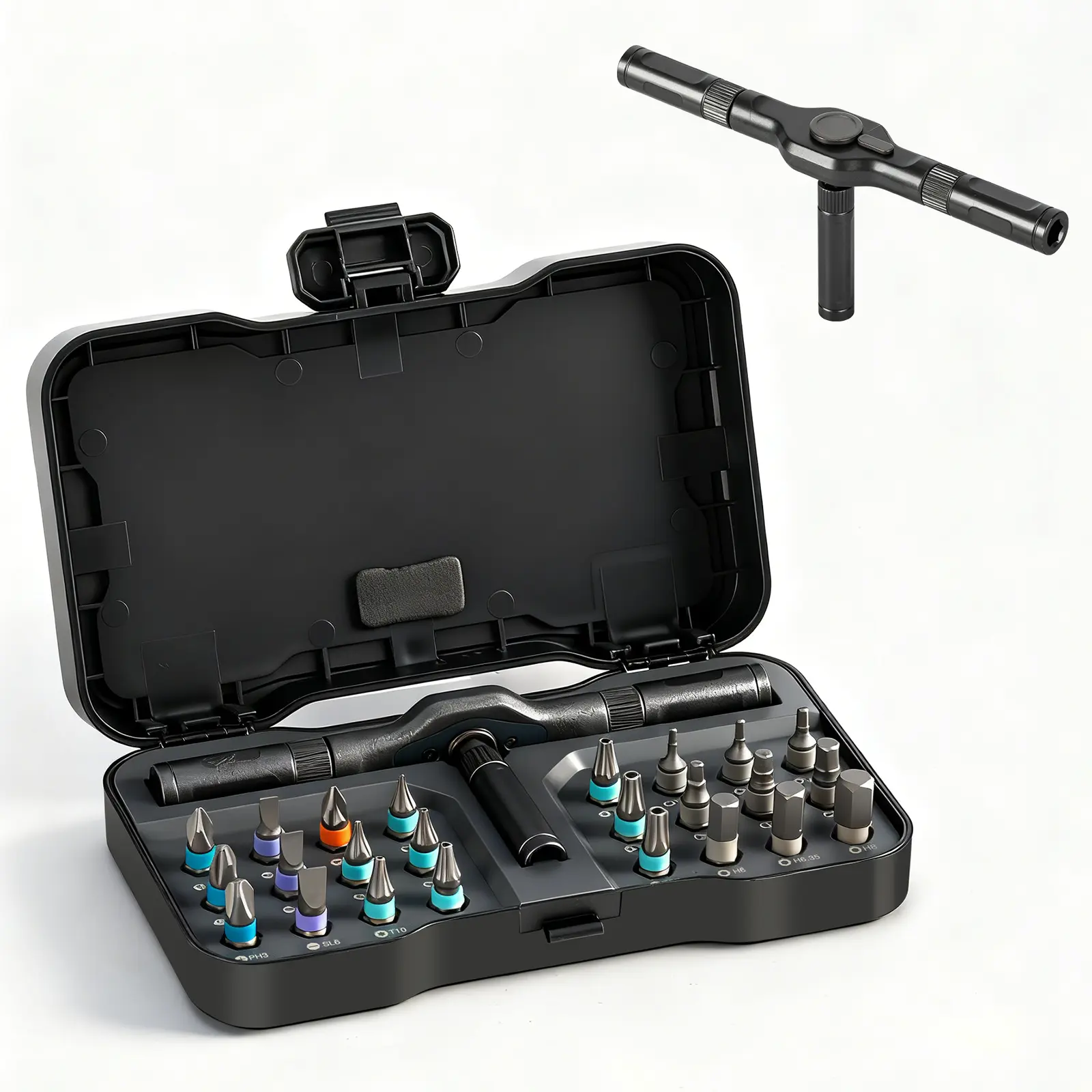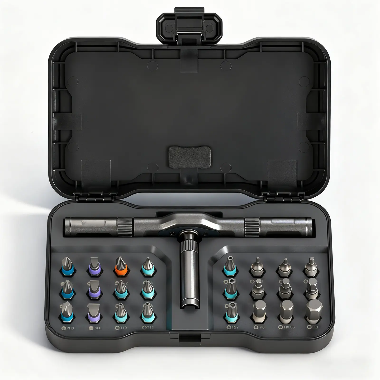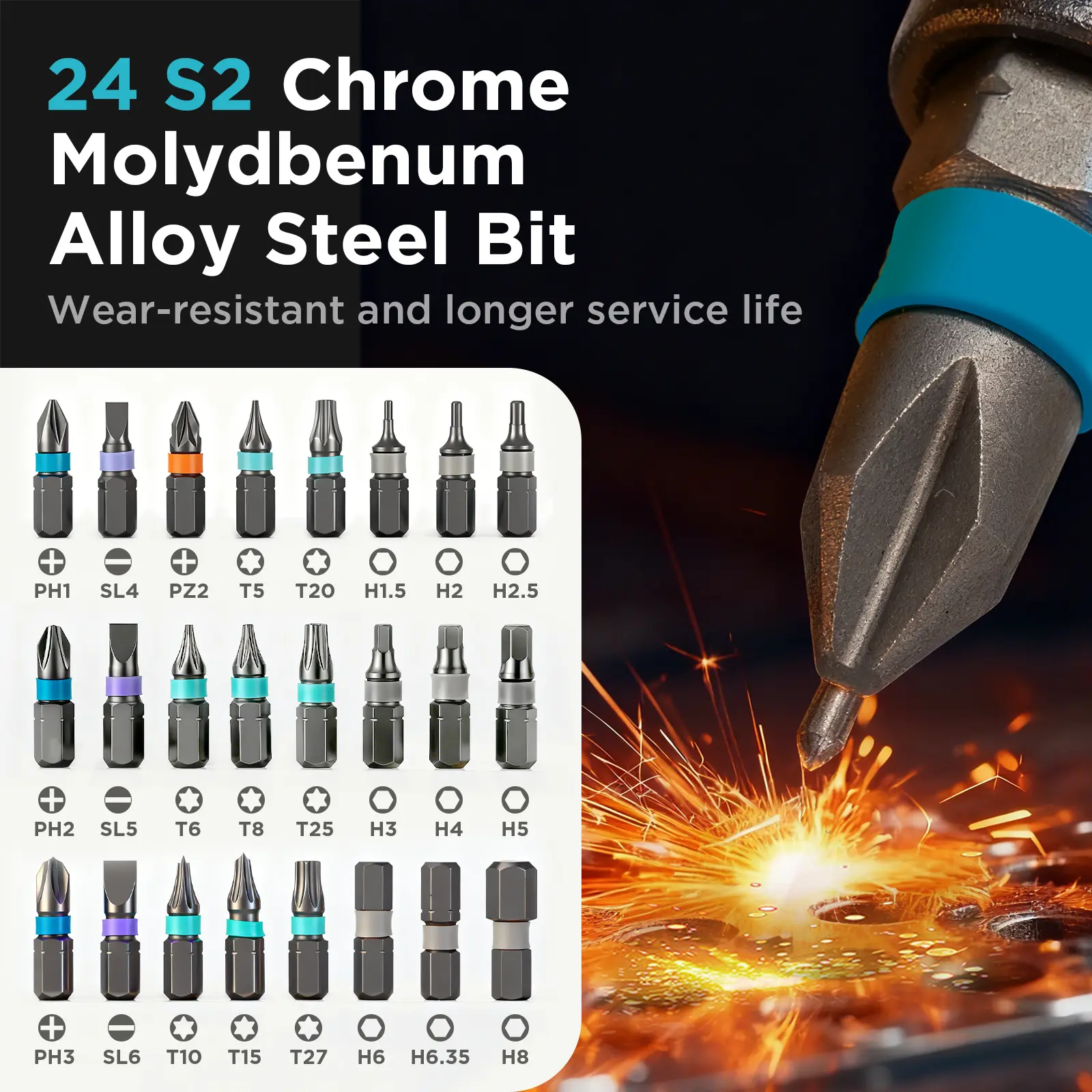 ·The 24-in-1 magnetic screwdriver set includes a wide range of bits, catering to 5 types of screws: PH000-PH2 Phillips, SL1.5-4.5 Flathead, T3-T6 Torx, H0.7-H3 Hex, and more. From Phillips to flat-head, Torx to hex, it provides all the necessary bits for different repair needs.