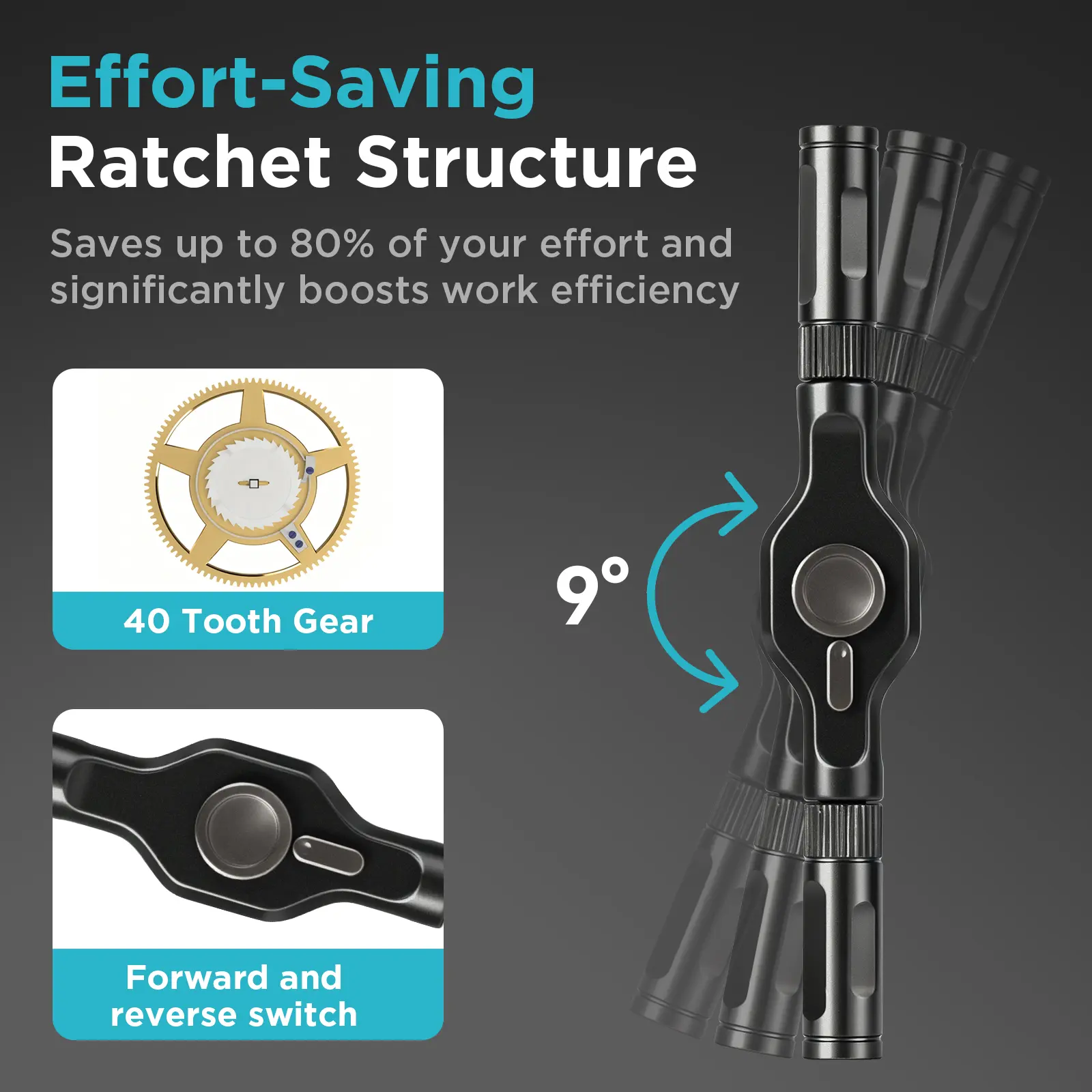 ·The ratcheting screwdriver set features a 58-tooth gear system for one-handed operation. The 6.2° swing angle maximizes efficiency, reducing wrist strain and saving 80% of your energy.