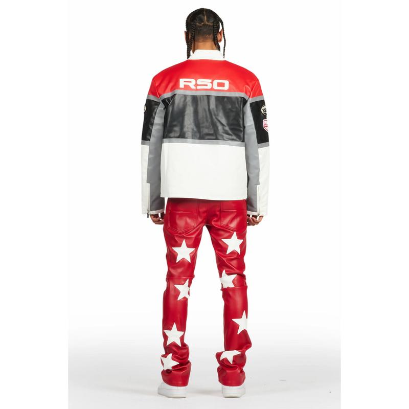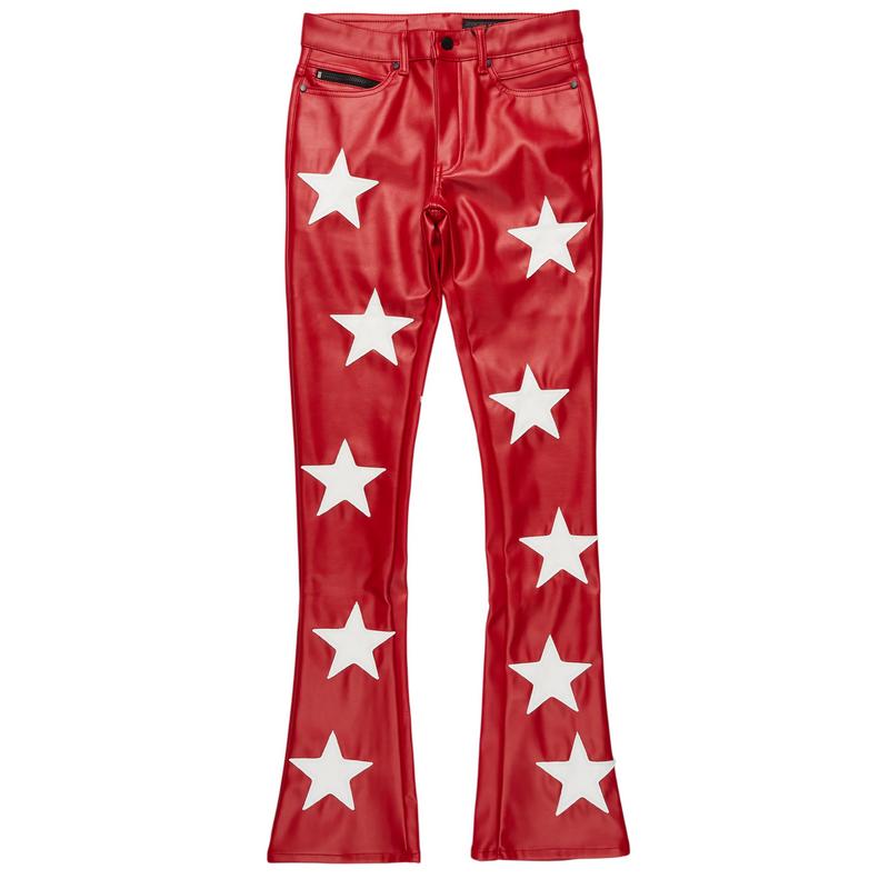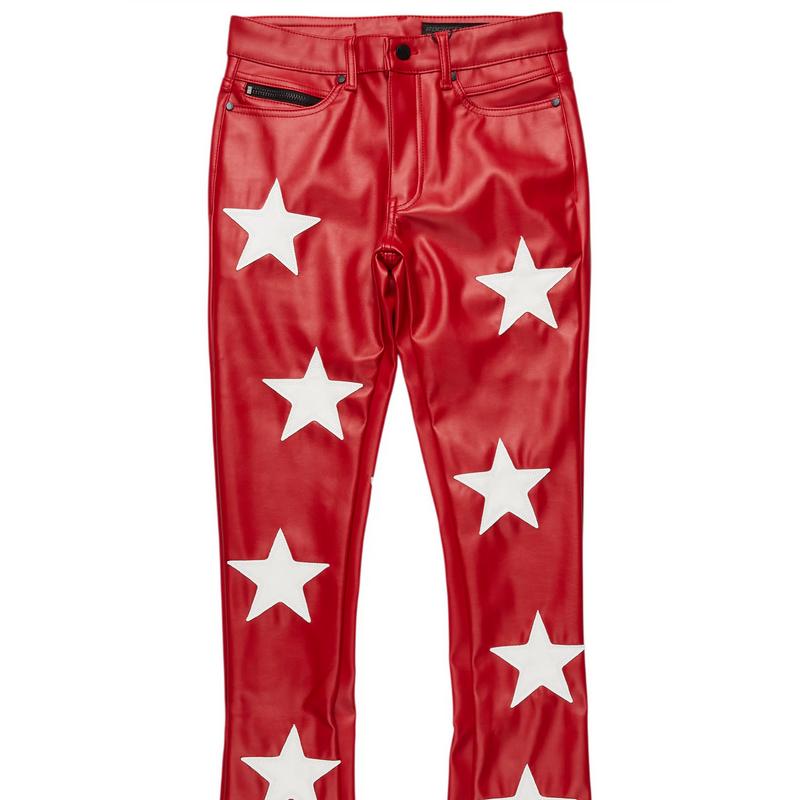 An urban stack jean for men red. Designed with faux leather fabric and custom detailing for a dope denim streetwear style.
