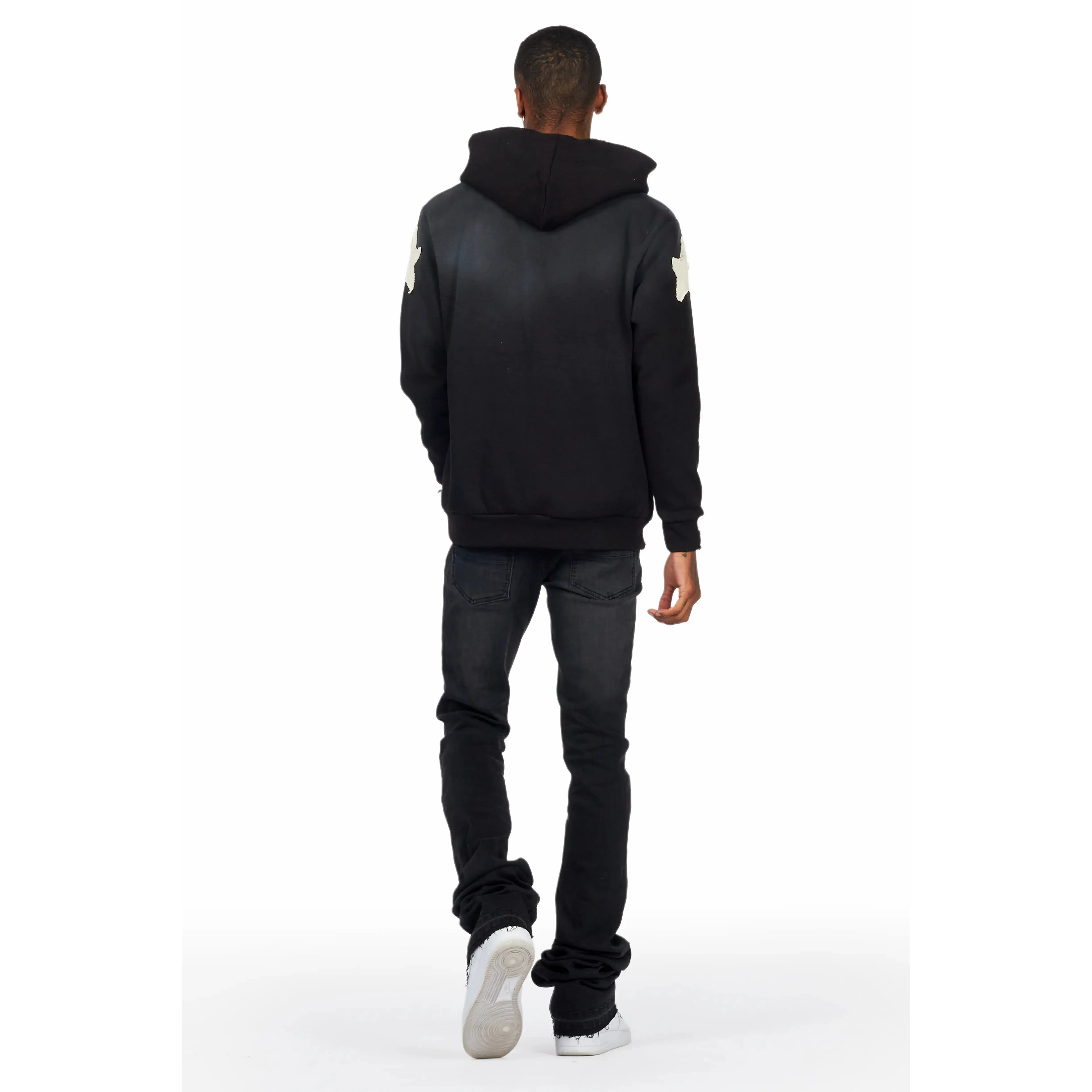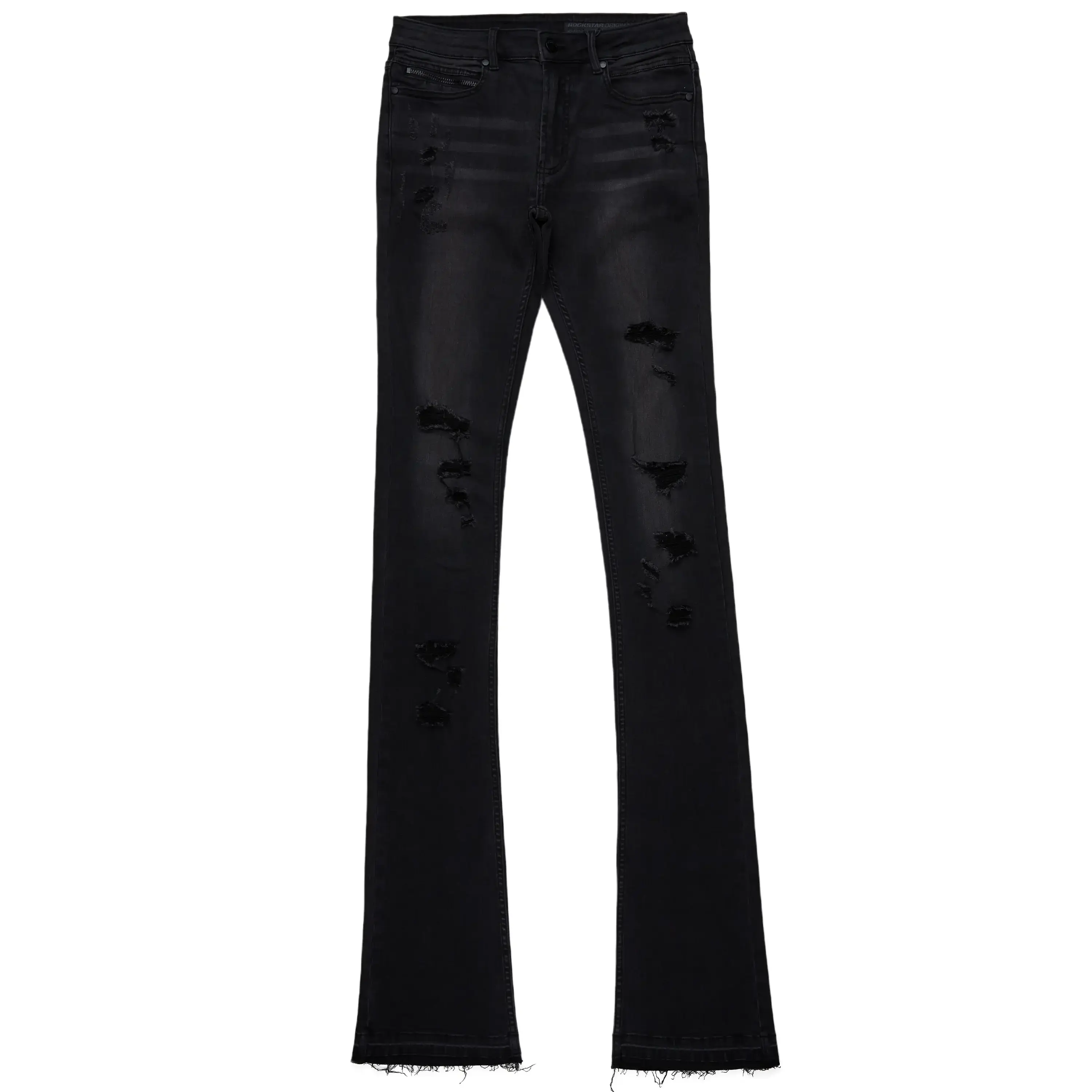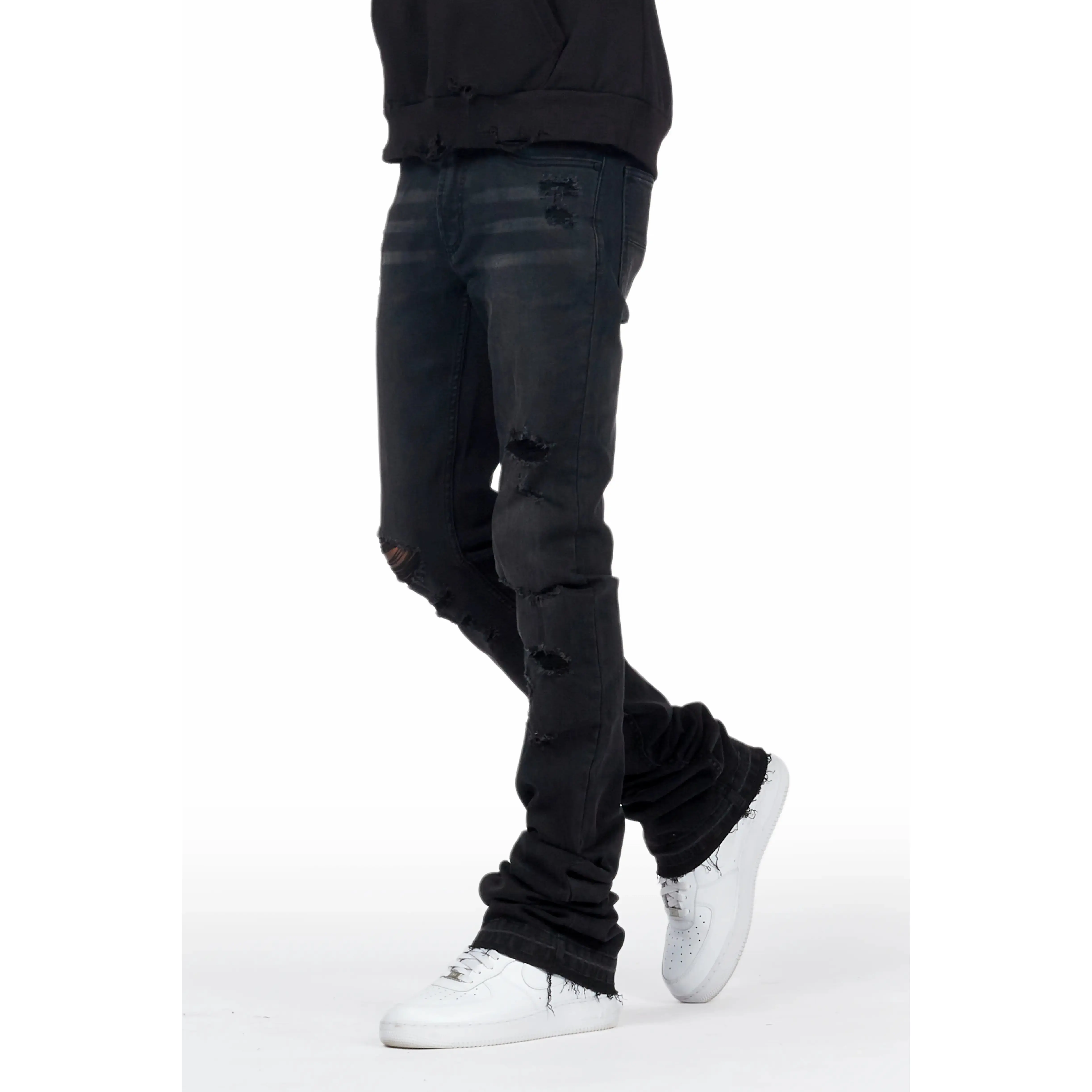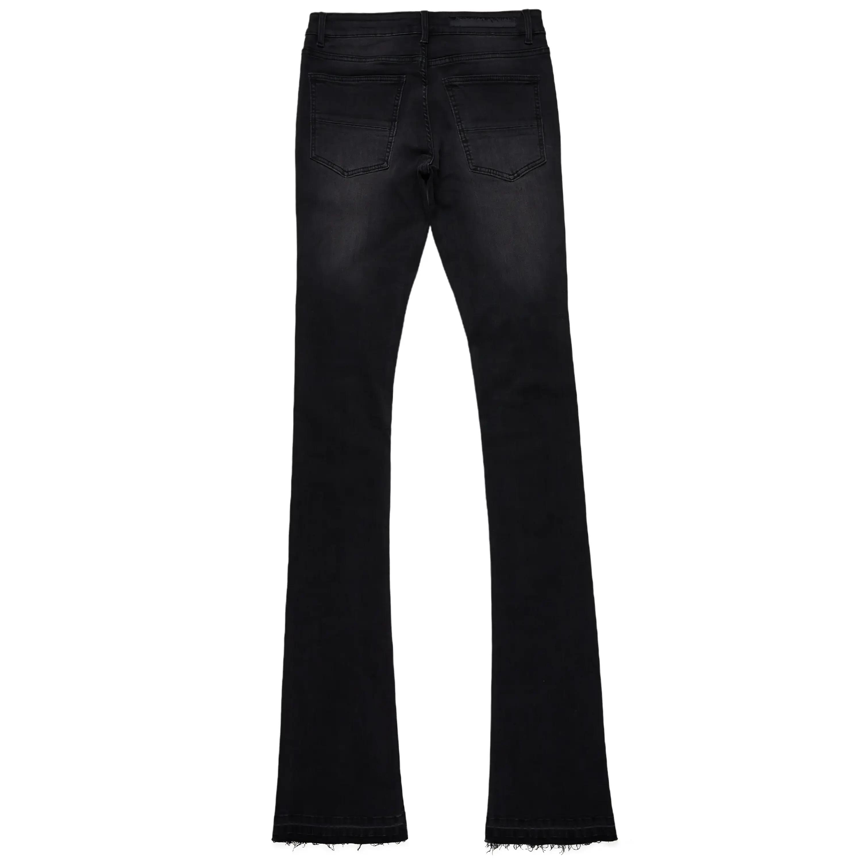 An urban super stacked flare jean for men in black. Designed with organic cotton and extra long legs for a dope denim streetwear style.