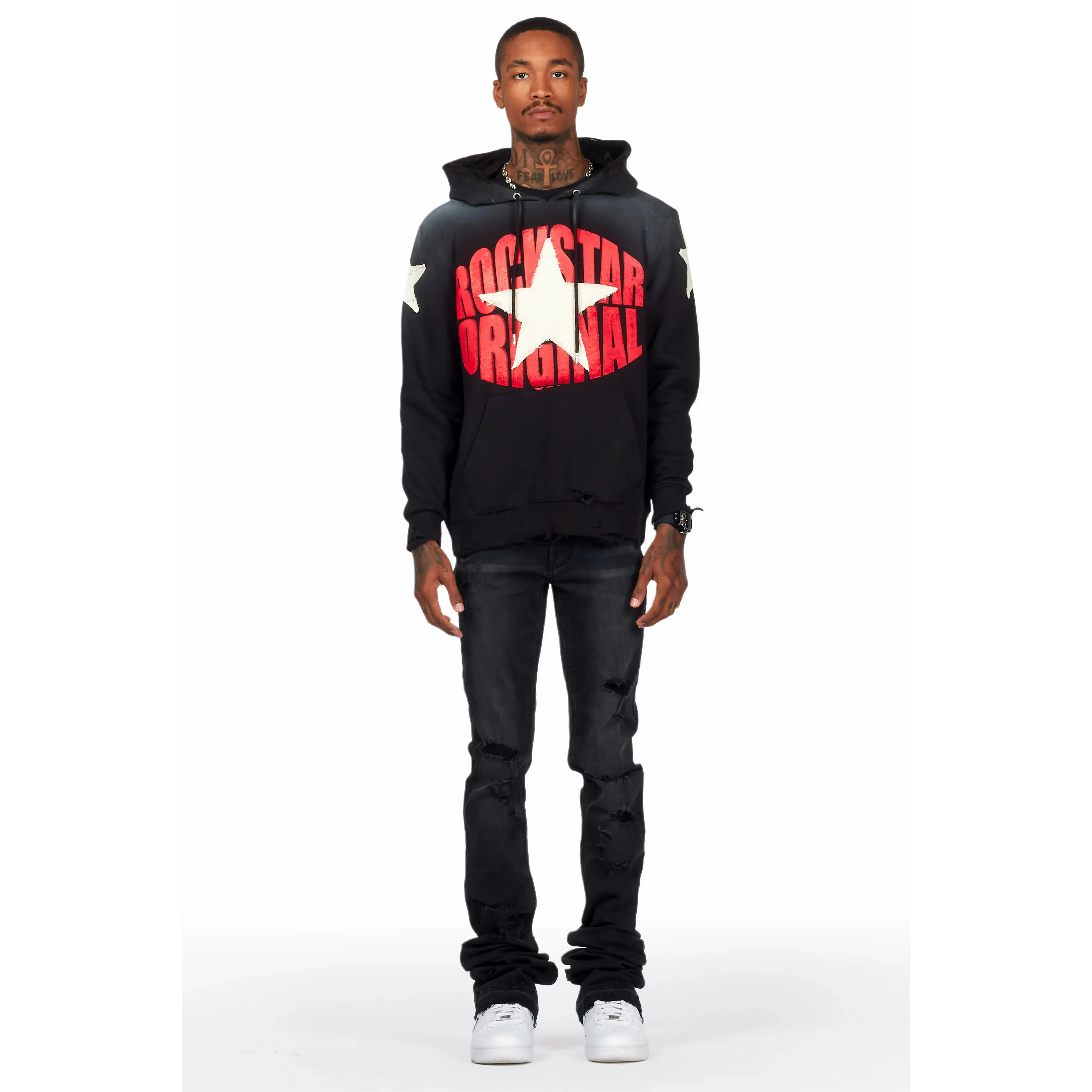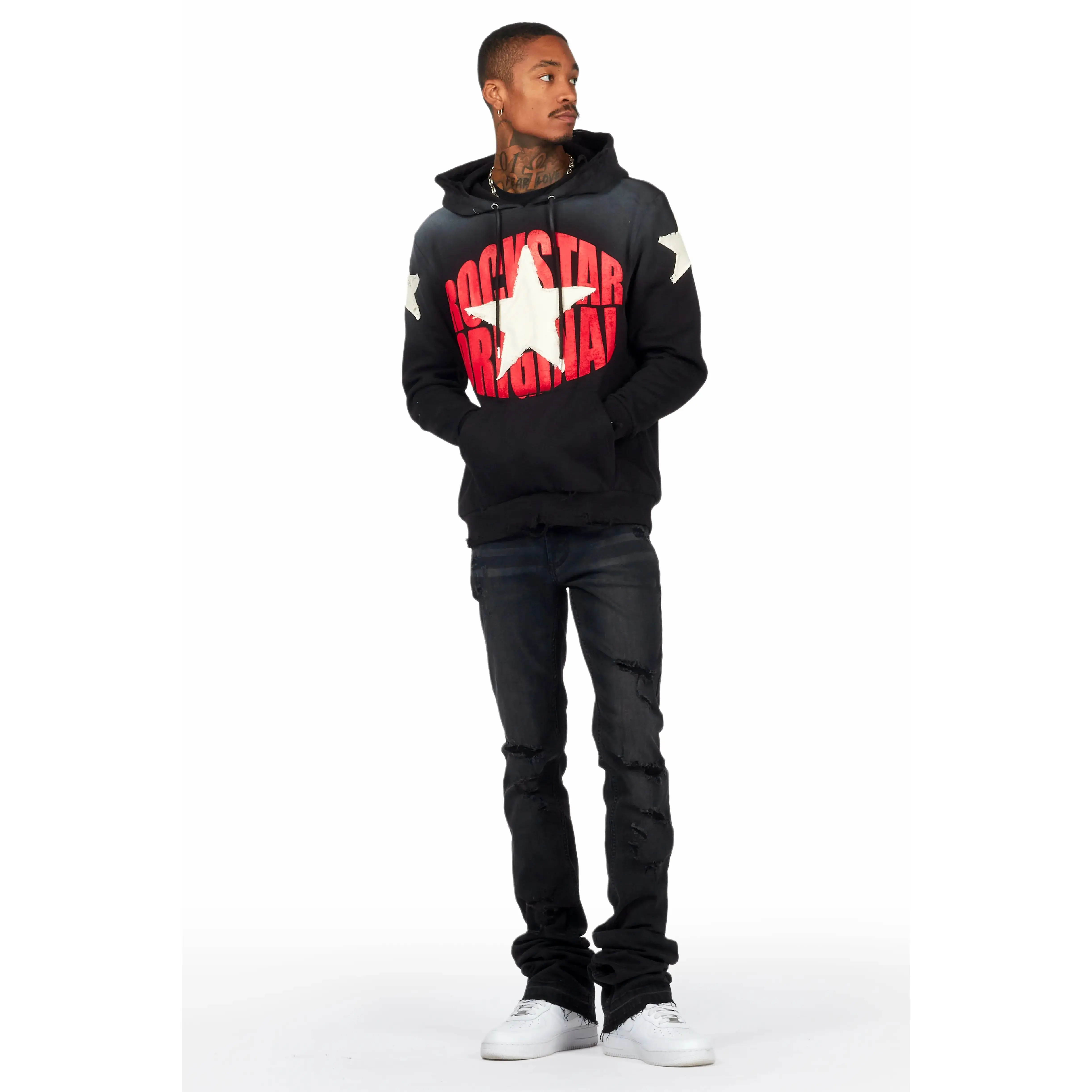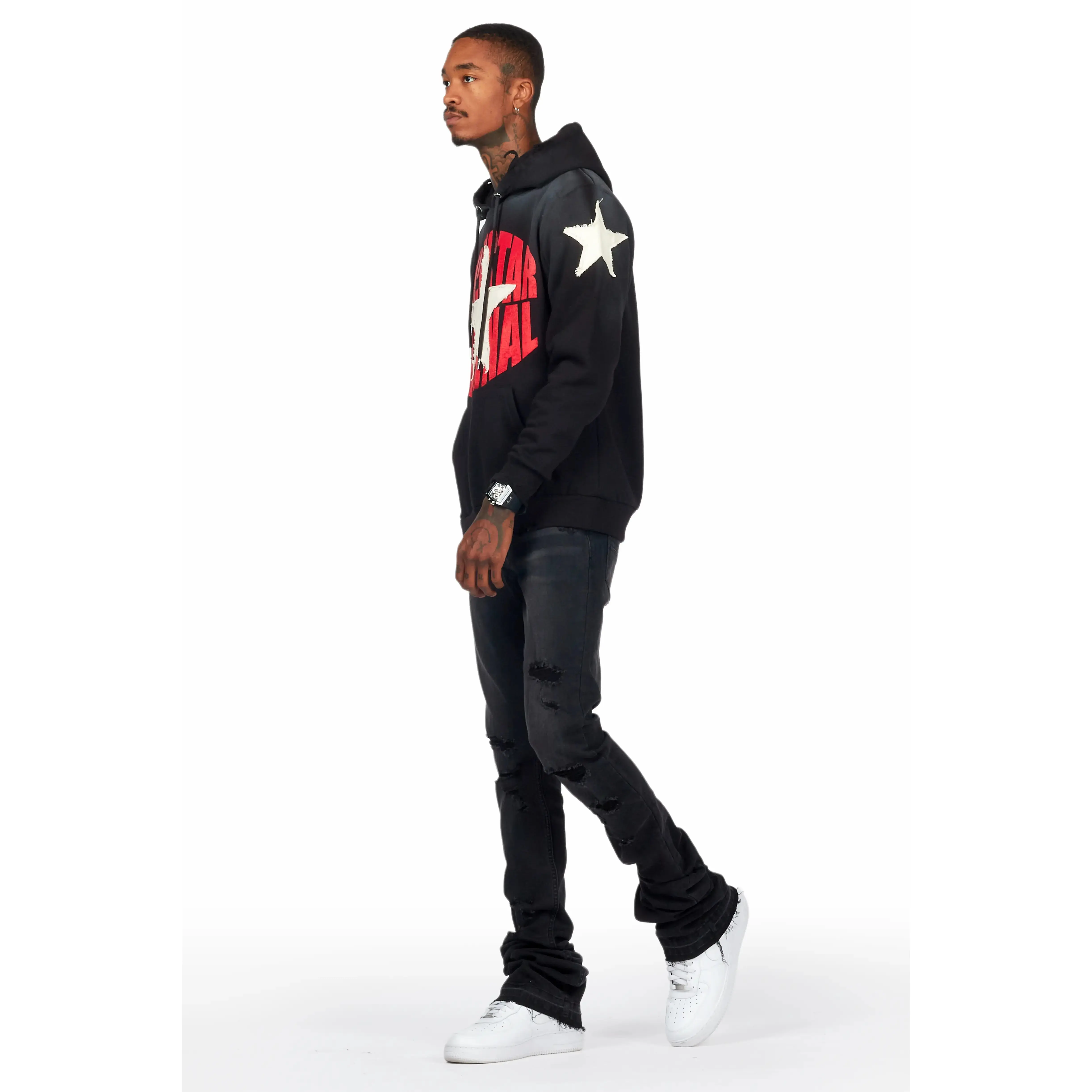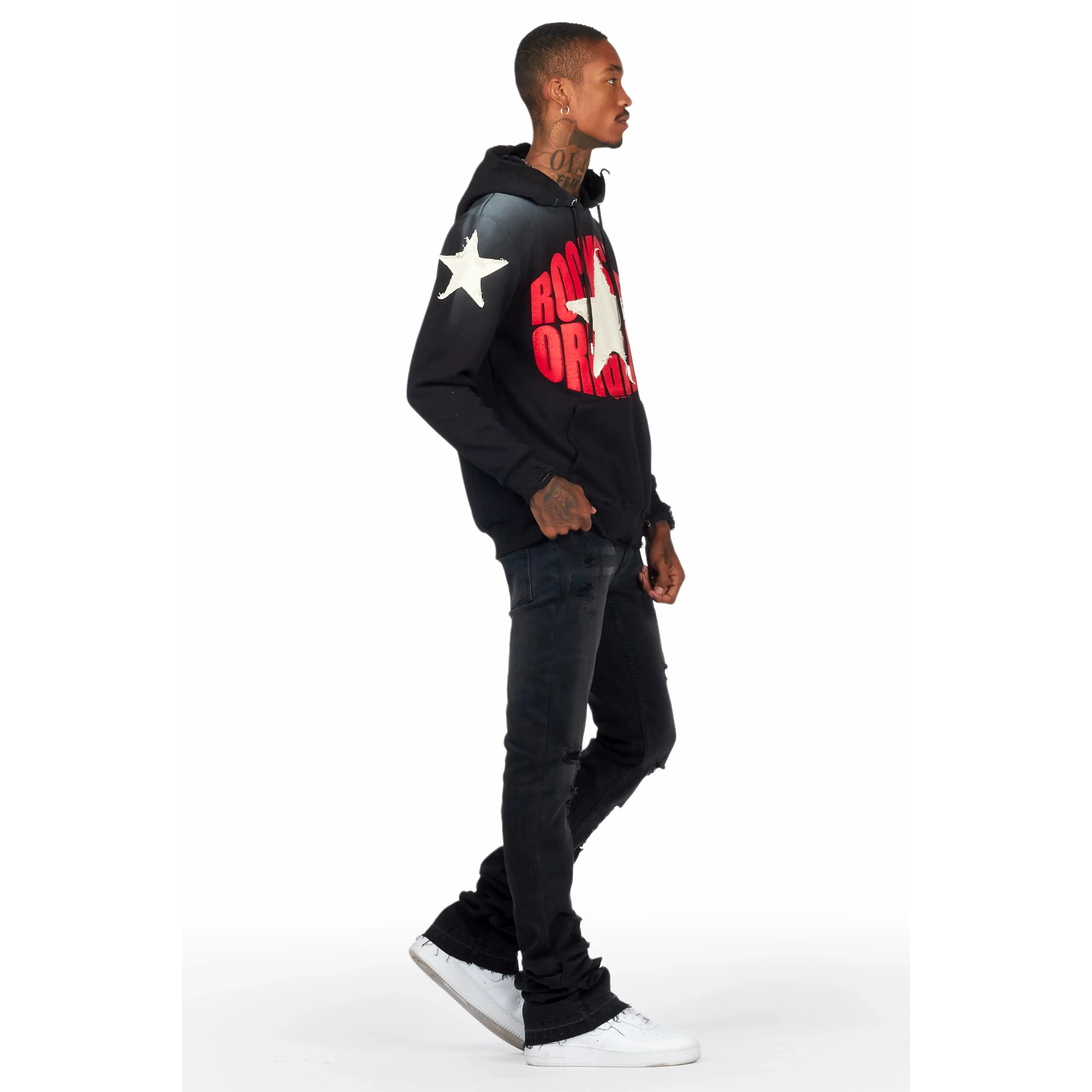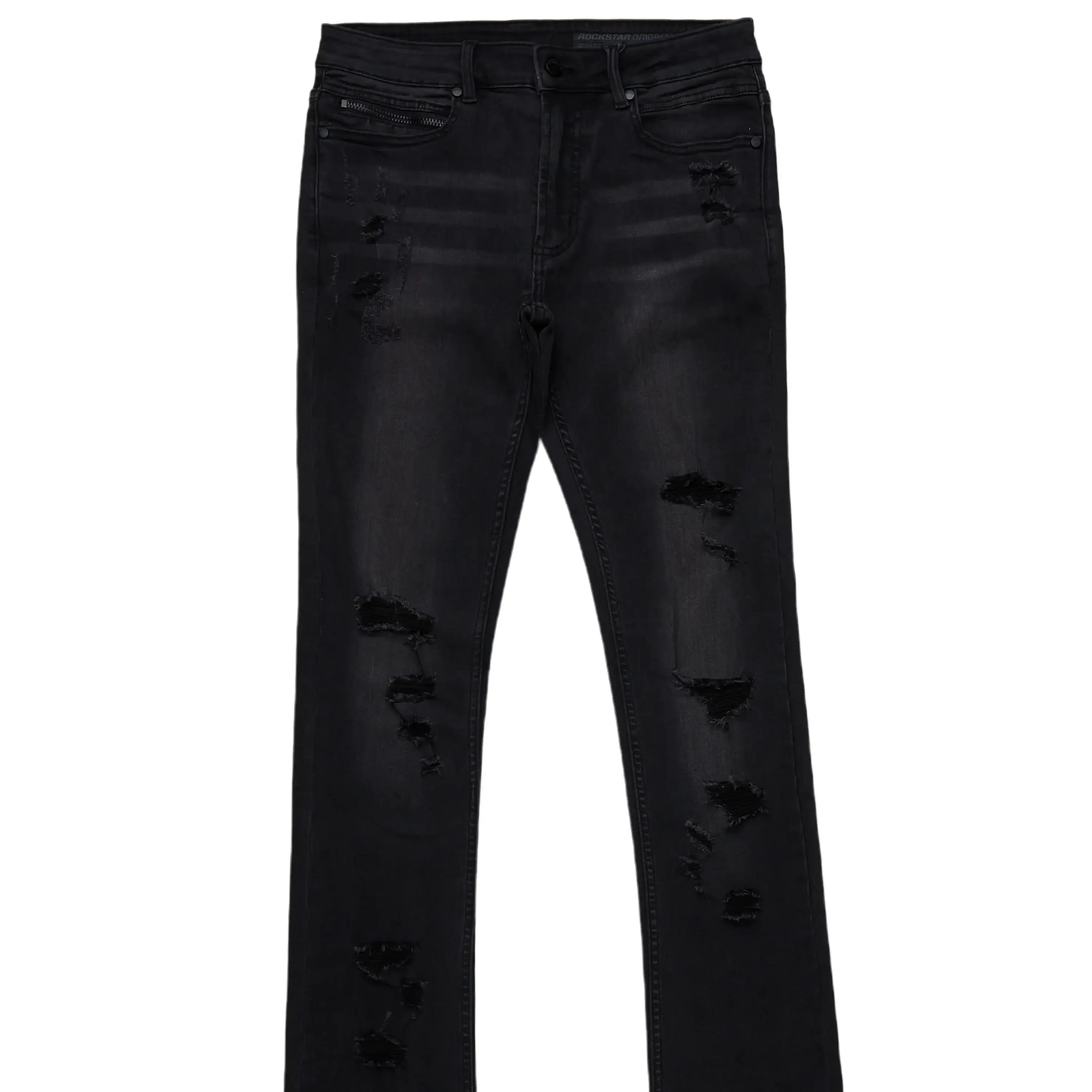 An urban super stacked flare jean for men in black. Designed with organic cotton and extra long legs for a dope denim streetwear style.