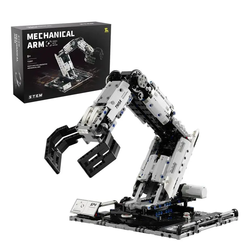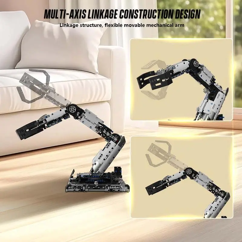 [Flexible Joints & Smooth Gears: Integrates extremely flexible joints and ultra-smooth power gears for fluid and precise movements., Effortless Object Grasping: Can easily grab objects with effortless control, resembling intelligent mechanical hands., RC Robotic Arm Set: Consists of 784 blocks, 4 M motors, a Li-ion battery box, and a remote control., 360-degree Rotation: Chassis allows for nearly 360 degrees of rotation and 90-degree maneuvering., Hand Claws: Can be opened and closed at 270 degrees, controlled by remote control., Gripping Capacity: Can grip items weighing up to 150 grams, depending on the item's size and surface smoothness., Innovative Design: Freed from being an ornamental piece, kids can operate it remotely every day, increasing its playability., Collector's Item: Suitable for building block enthusiasts and collectors., Educational Value: Promotes children's hand-eye coordination and hands-on skills., Gift Idea: Perfect gift for boys and girls aged 8-14, ideal for birthdays and special occasions.]