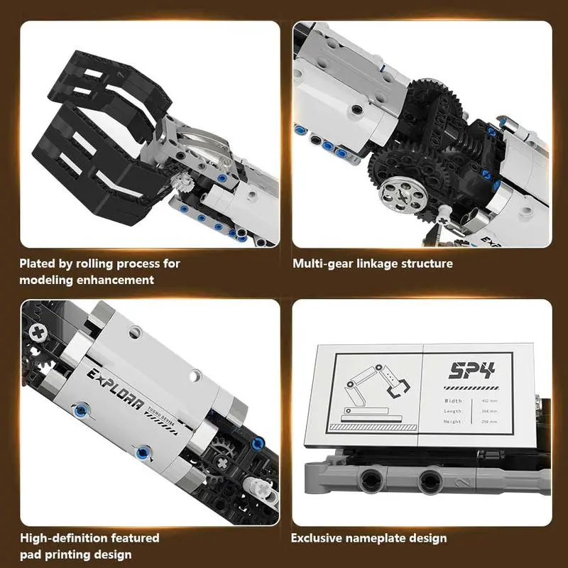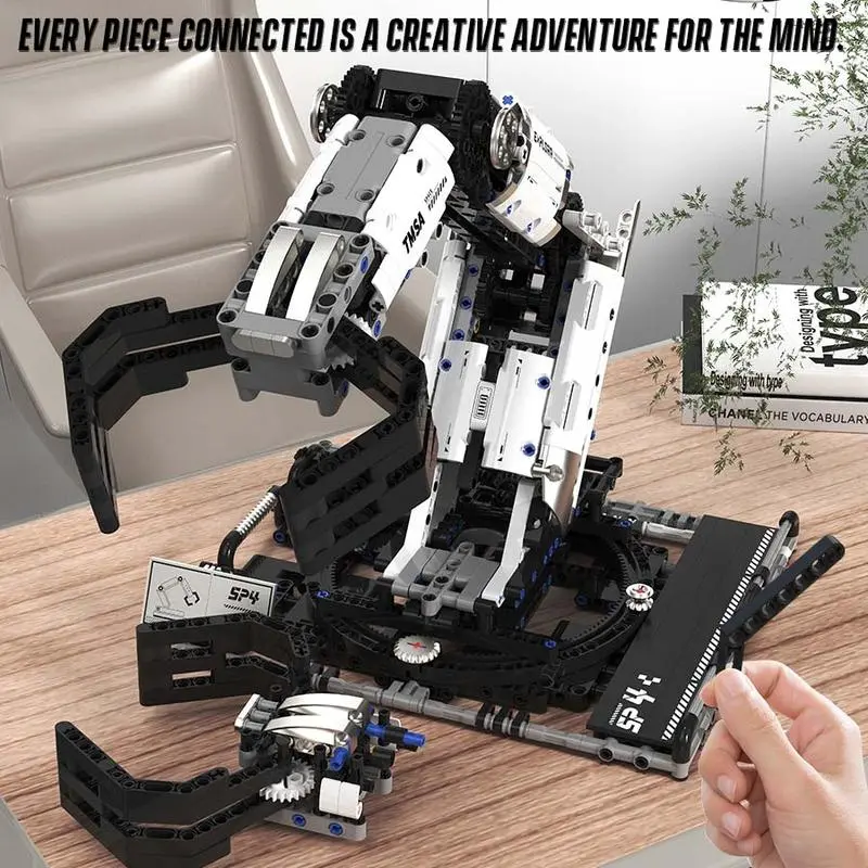 [Blocks: 784 pieces, Motors: 4 M motors, Battery: Li-ion battery box, Control: Remote control, Rotation: Nearly 360 degrees, Maneuvering: 90 degrees, Hand Claws: Open and close at 270 degrees, Gripping Capacity: Up to 150 grams]