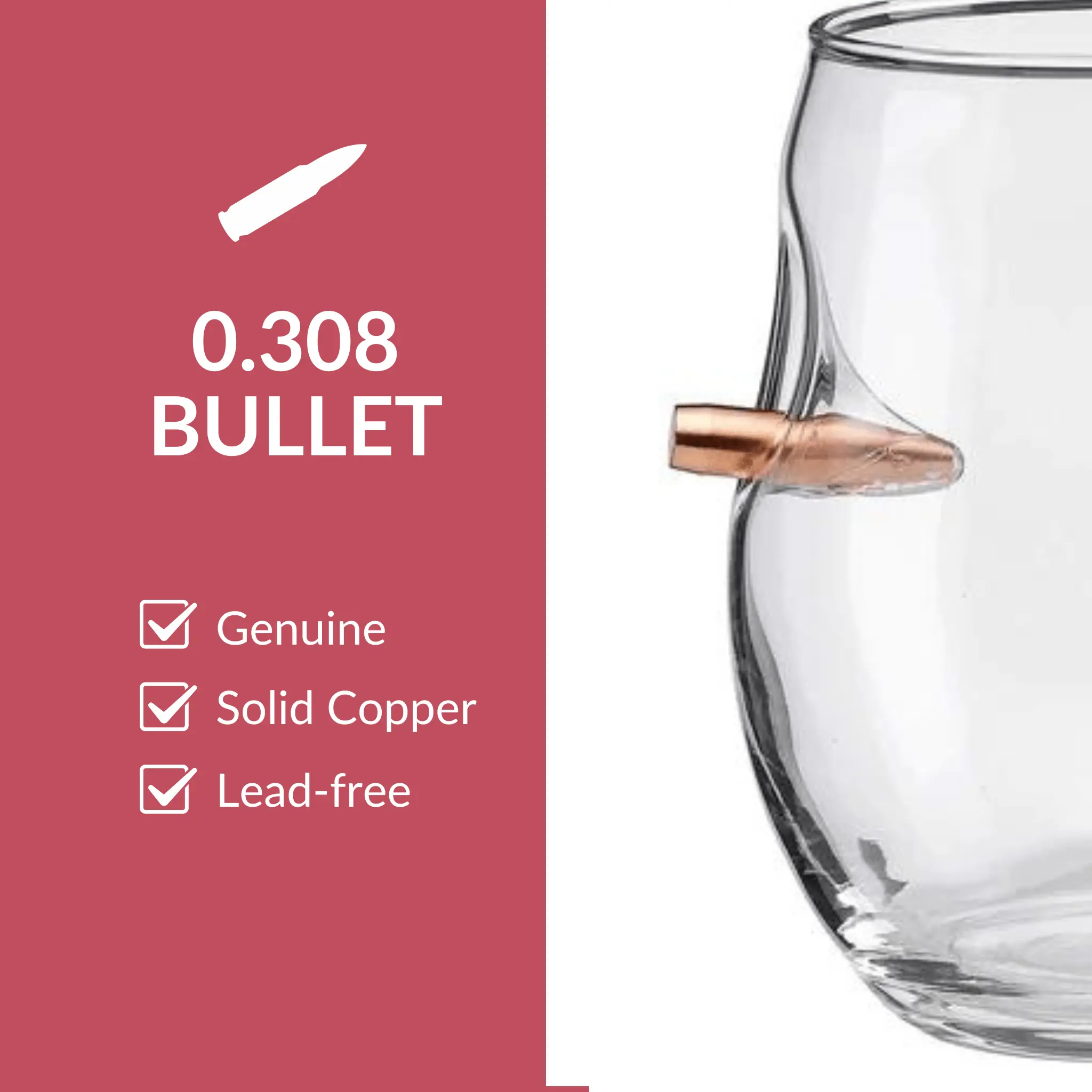 Stemless Wine Glass with Bullet by BenShot is perfect to add a little flair to your drinking experience. Make every sip taste like freedom with our handcrafted stemless wine glass. At 15oz, it's the perfect size to enjoy your favorite red or white. But what makes this glass stand out from the rest is the real .308 caliber bullet embedded right in the side of the glass!