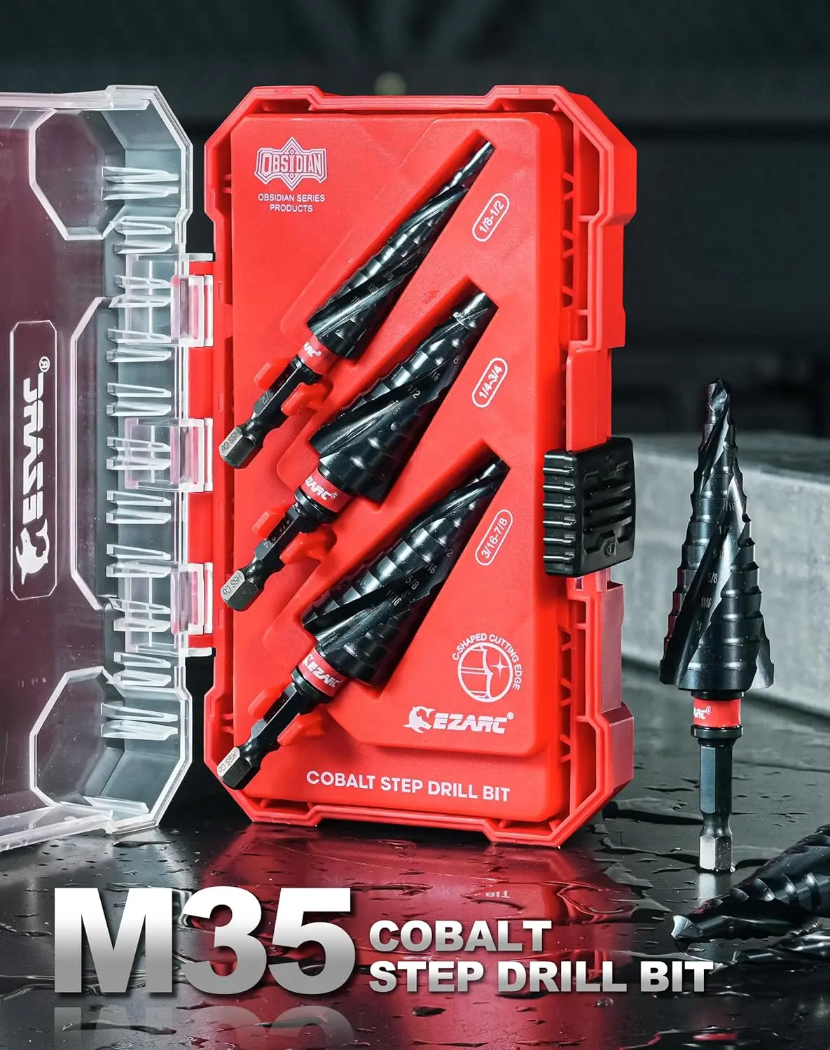 The step drill bits are neatly organized in a compact case for easy transportation and storage. The spiral flutes and stepped design of the drill bits allow for seamless and efficient drilling through various thicknesses.