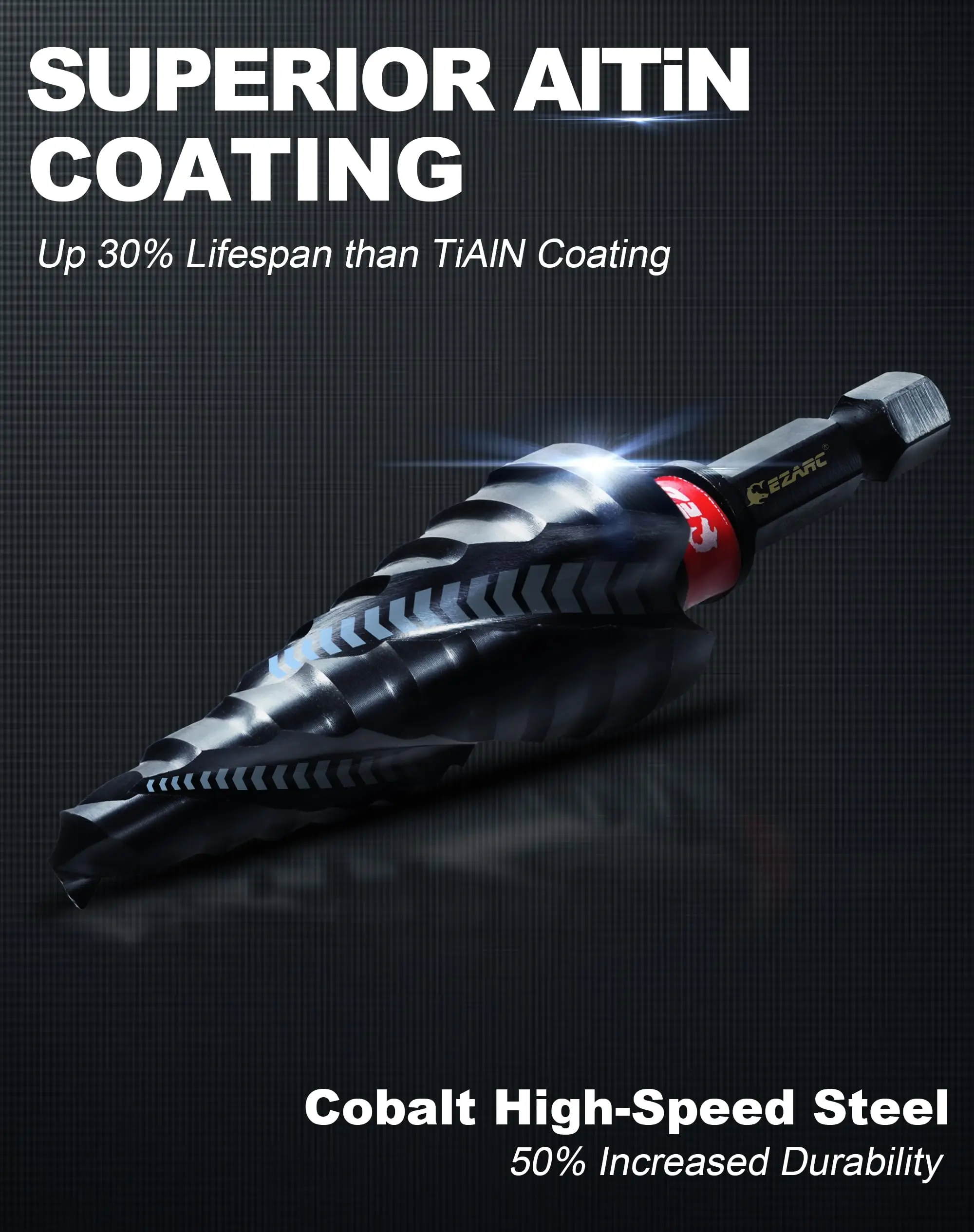 Step bits coated with aluminum titanium nitride, rated at 89HRC for exceptional hardness and thermal properties. This coating offers superior resistance to heat, wear, and corrosion, with high adhesion and low friction. Laboratory tests show it more durable than steamed black oxide coating for longer bit life.