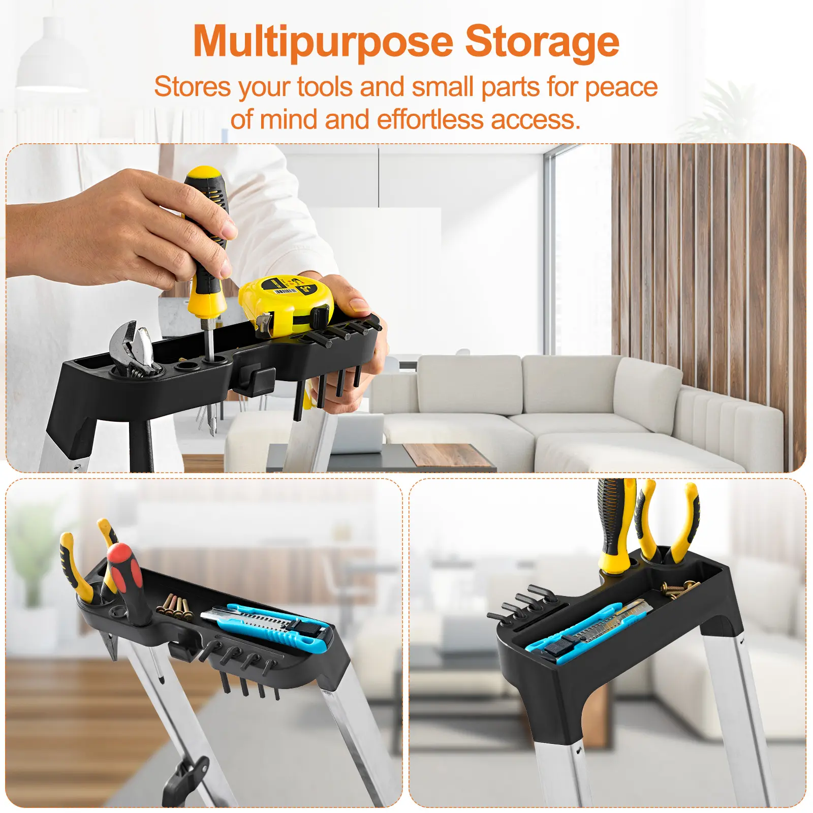 Boost productivity with the integrated tool tray on this folding step stool. This feature keeps tools, paint, or supplies within easy reach, turning the ladder into a portable workstation. 🛠️