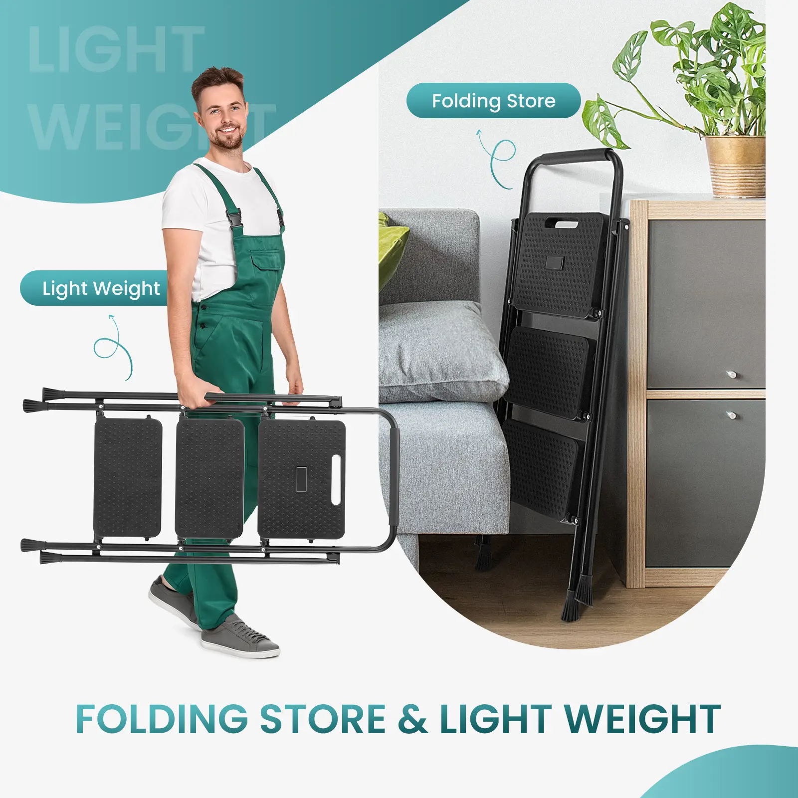 ·【Space Saving】:This step ladder folds up and can be placed under a bed, behind a door or in a closet for a great space saver!