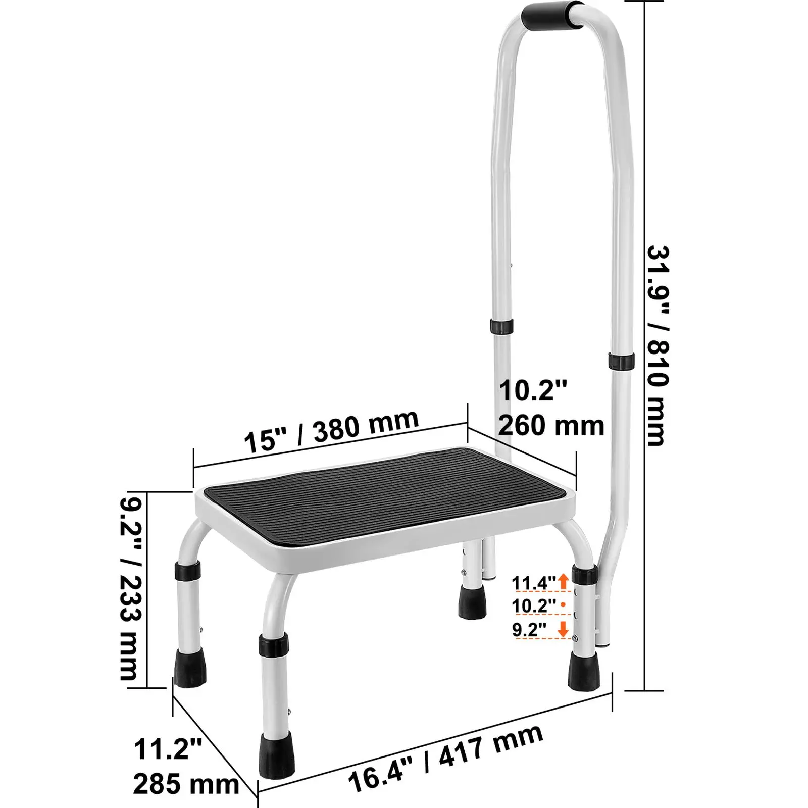 • Three-Stage Height Adjustable with Handrail:This household step stool features three-stage height adjustments for both the stool legs and handrail. The stool leg height ranges from 9.2" - 10.2" - 11.4" / 233 mm - 260 mm - 289 mm, while the handrail height ranges from 31.8" - 32.7" - 33.9" / 810 mm - 830 mm - 860 mm. Hole positioning locks provide an easy way to adjust the height while maintaining the stool's stability.