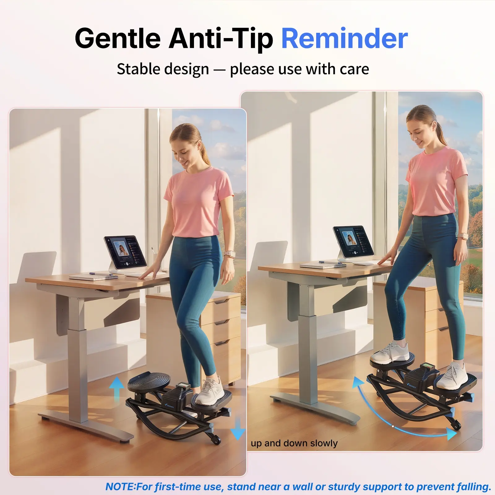 Beginners or those with balance concerns should hold onto something stable when getting on/off. While the stepper itself is steady, maintaining centered posture is key to safety.