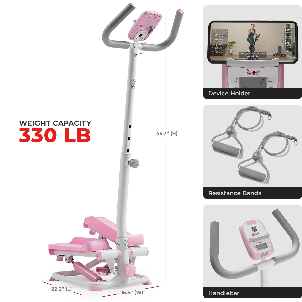 Introducing the Sunny 2-in-1 Premium Power Stepper, your perfect home workout companion! With a robust V-shaped design supporting up to 330 LB, this durable stepper features adjustable handlebars and a pulse sensor for heart rate monitoring. Enjoy targeted workouts with included resistance bands and track your progress on the digital LCD monitor. Compact and easy to set up, it’s ideal for any home gym!