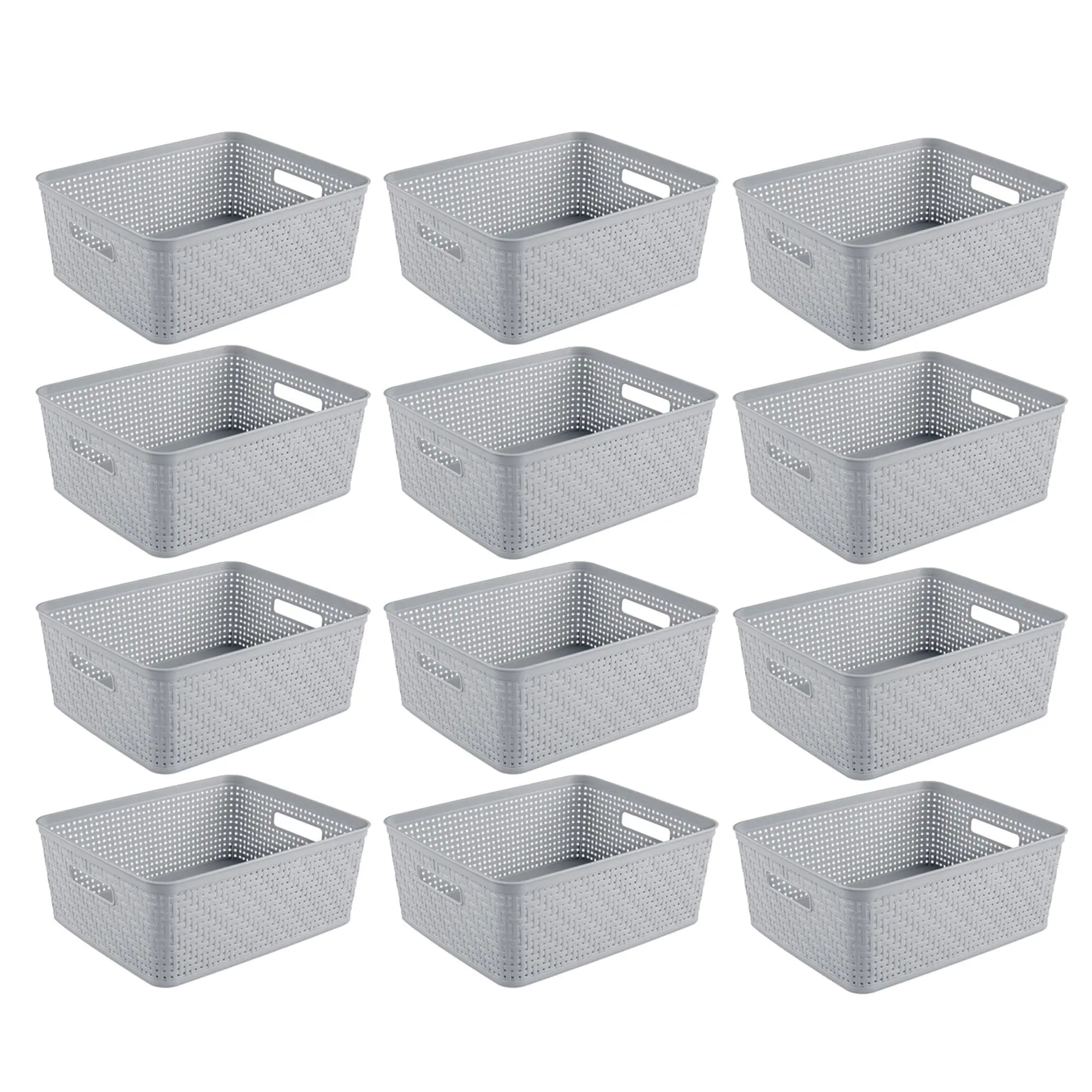 If you are looking for a solution to control clutter in your home, the 12-pack of Sterilite Short Baskets may be the ideal product for you.These short baskets are a practical and stylish storage solution for any room in the home. Measuring 14 by 11.5 by 5.38 inches, these rectangular baskets are ideal for organizing clutter in busy areas of your home. With handles on the sides, these basket organizers are easy to lift and carry, making them an ideal choice for storing toiletries in the bathroom, laundry essentials in the laundry room, or snacks in the pantry.Made from durable materials, these storage solutions ensure the safety of your family and the environment. The woven pattern of the baskets adds a touch of decor to any room, while the reinforced rim provides added strength and stability.Whether you're looking to declutter your countertops, organize your closet, or create more storage space in your home, the 12-pack of Sterilite Short Baskets is a versatile and practical choice to help you achieve your organizational goals.