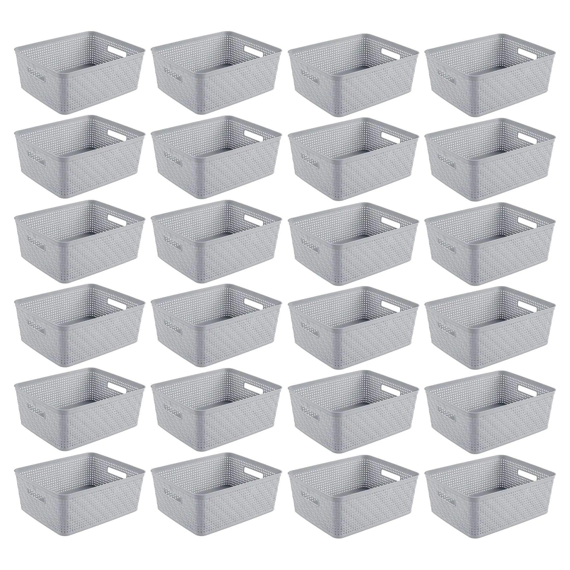 If you are looking for a solution to control clutter in your home, the 24-pack of Sterilite Short Baskets may be the ideal product for you.These short baskets are a practical and stylish storage solution for any room in the home. Measuring 14 by 11.5 by 5.38 inches, these rectangular baskets are ideal for organizing clutter in busy areas of your home. With handles on the sides, these basket organizers are easy to lift and carry, making them an ideal choice for storing toiletries in the bathroom, laundry essentials in the laundry room, or snacks in the pantry.Made from durable materials, these storage solutions ensure the safety of your family and the environment. The woven pattern of the baskets adds a touch of decor to any room, while the reinforced rim provides added strength and stability.Whether you're looking to declutter your countertops, organize your closet, or create more storage space in your home, the 24-pack of Sterilite Short Baskets is a versatile and practical choice to help you achieve your organizational goals.