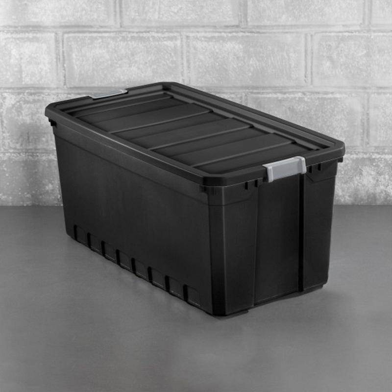 Organize your closet, office, craft supplies, or mudroom, putting everything in its proper place with the help of these Sterilite 50-Gallon Rugged Industrial Stackable Storage Totes with Lids.These heavy-duty storage totes are household essentials and provide the perfect storage solution for your home. The big, 50-gallon capacity ensures you can store items of all sizes. The channeled walls of these storage totes provide added strength and help to resist crushing under heavier loads. The contoured end panels create integrated handles for comfortable lifting. Robust latches securely attach the lid to the base while the textured finish provides a non-slip grip.The tight-fit drip-resistant lid provides maximum protection against items getting wet. Deep recessed lids allow for secure stacking to maximize available storage space. The design of the lid, as well as the keyholes, provides options for tie-downs to keep totes in place when transporting and storing. These durable storage totes are ideal for packing, moving, or storing seasonal items like clothing, crafting supplies, office necessities, a holiday tree, and more safely in your home.Enjoy the peace that full organization can bring to your home with these 50-Gallon Rugged Industrial Storage Totes with Lids from Sterilite.