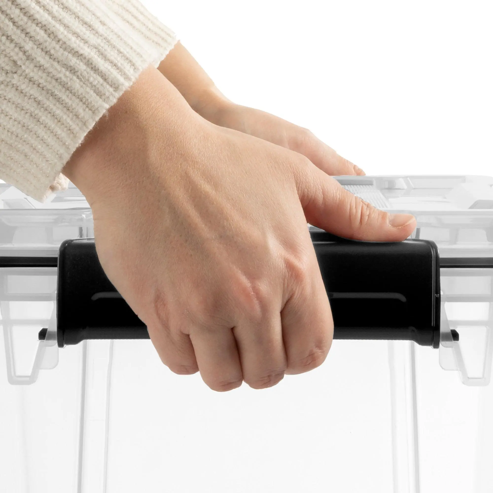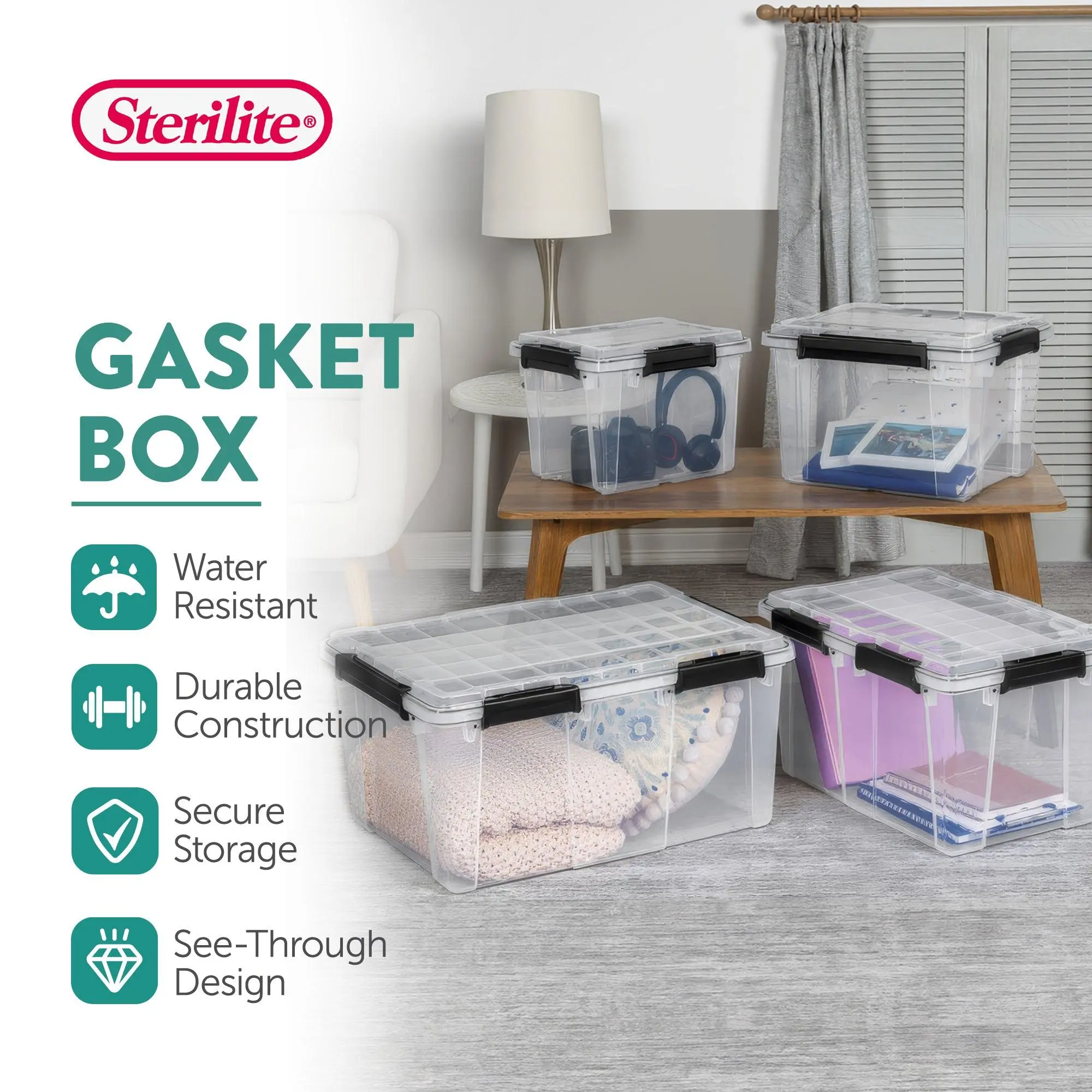 When safeguarding your belongings is the ultimate goal, step up to a new level of protection with Sterilite's Waterproof and Dustproof 54 Quart Gasket Box. Designed for dependable, long-term storage, this IP68-rated storage container features a high-performance gasketed seal that keeps out water, air, dust, and even pests. Built to withstand tough environments, this bin is fully submersible, offering superior peace of mind when storing important or sensitive items.A durable silicone gasket runs along the lid to create a tight seal, while wide, heavy-duty latches provide multiple secure touchpoints to ensure a firm closure every time. The robust latching system works together with the gasket to help protect contents from moisture and environmental exposure. Comfort-grip handles are integrated into the design, making lifting, carrying, and transporting the bin effortless—even when fully loaded.Constructed with a rugged, reinforced design, this container is ideal for use in basements, garages, attics, sheds, or other areas where temperature changes and dust are common. The reinforced lid adds structural strength, while the deep recessed lid design allows multiple bins to stack securely and efficiently, helping you maximize vertical storage space. For best results when stacking, use good judgment and always place the heaviest bin at the bottom for stability.The clear plastic base and lid allow you to quickly identify contents from any angle without opening the container, saving time and effort when organizing seasonal clothing, keepsakes, important documents, emergency supplies, or other large valuables. With overall assembled dimensions of 23 1/8" L x 15 5/8" W x 13" H, the Sterilite 54 Quart Gasket Box combines durability, visibility, and advanced protection to keep your belongings clean, dry, and secure year-round.