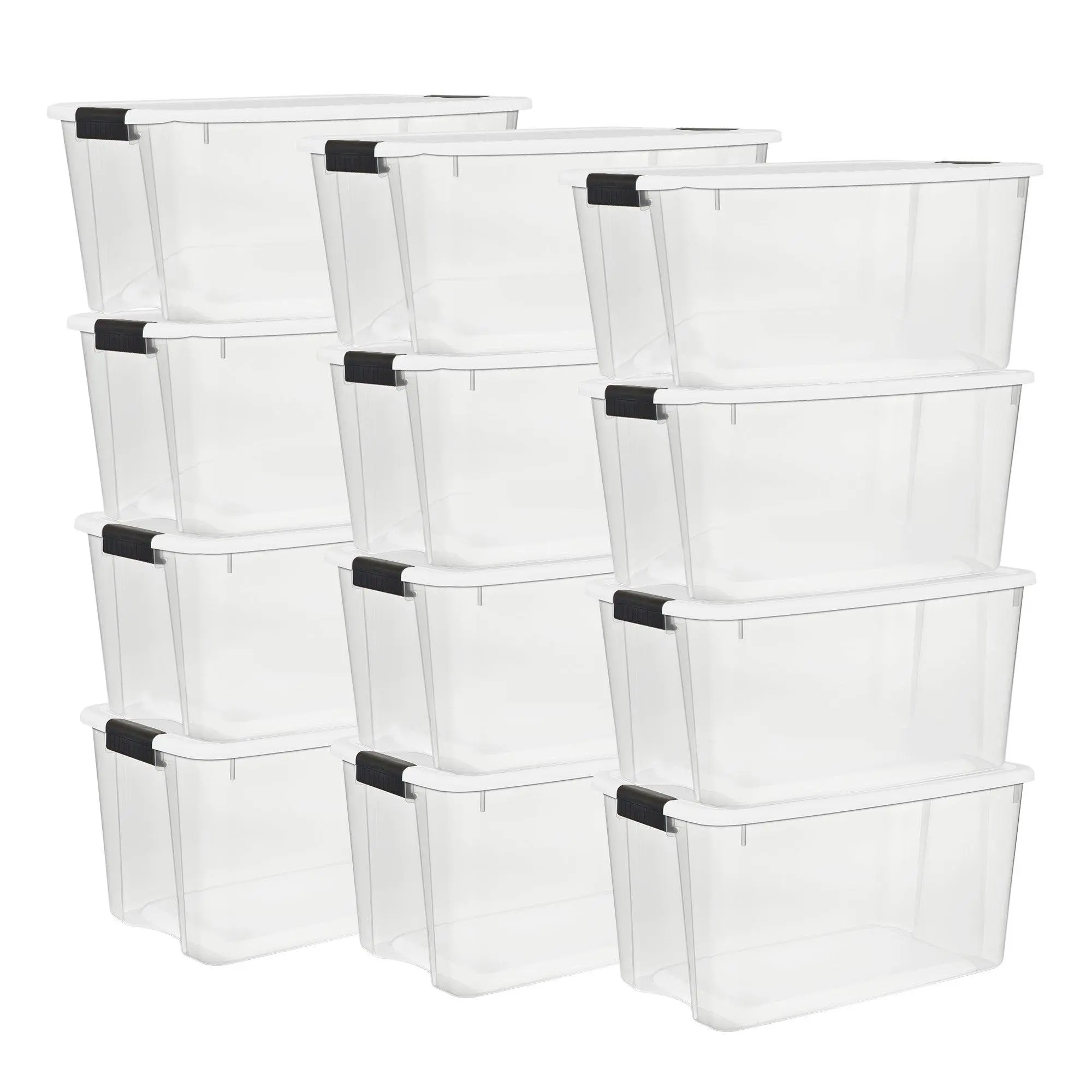 Set of 12 latch clip storage bins are the perfect size for boots, accessories, small household tools, and supplies, with a clear base allowing quick viewing of contents