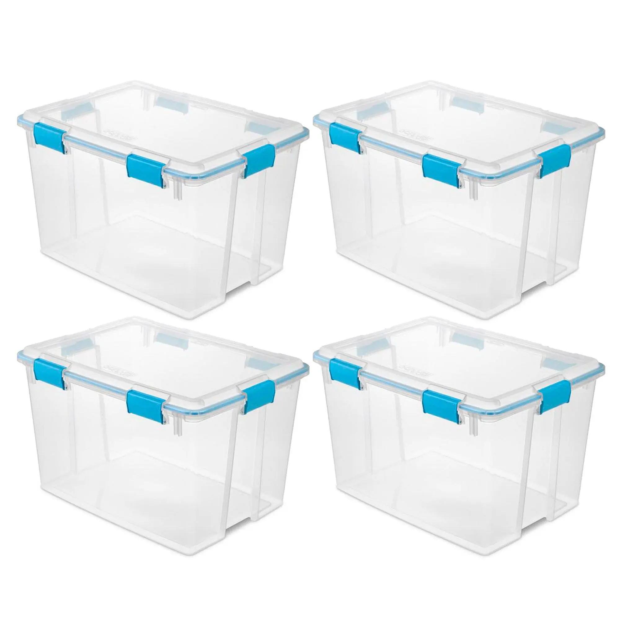 Keep your home organized with this 4-pack of Sterilite 80-Quart Clear Plastic Stacking Storage Containers with Gasket Latched Lids that will help you with your moving or storage needs.