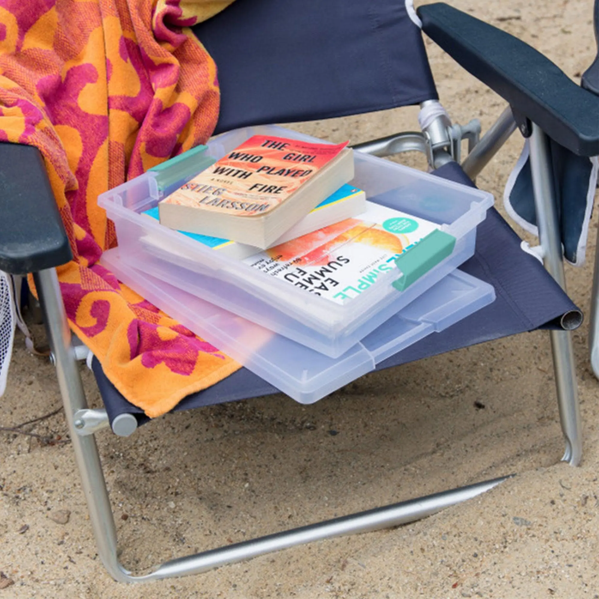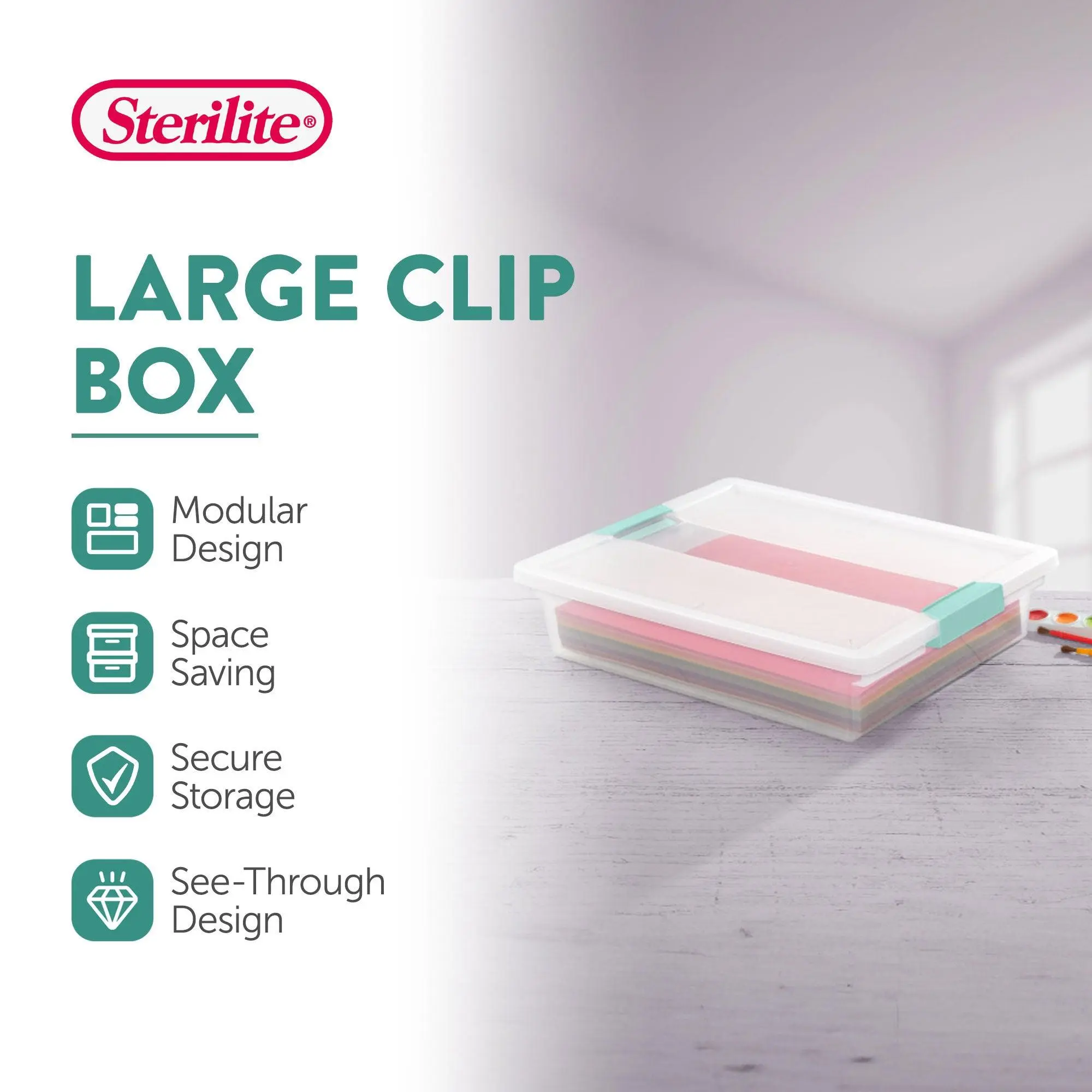Organize the closet, office, classroom, craft supplies, or playroom, putting everything in its proper place with the help of these Sterilite 5.7 Quarts Large Plastic Stackable Storage Bins with Clear Latch Lids.Durable storage totes are ideal for storing magazines, craft books, school supplies, or longer craft items safely in your home, classroom, or office. They can also be used for construction paper, felt, coloring books, and more. Whether you're safely storing and organizing standard 8.5 by 11-inch notebooks, paper dolls, newspaper clippings, or knick-knacks, you can easily identify contents from the outside thanks to the clear plastic design.Indexed lids allow multiple boxes to be stacked securely maximizing vertical spacing. Durable and built for long-term storage, you can rest assured your items will remain free from dust, dirt, or debris, even when stored in unfinished basements, garages, or exterior storage rooms.Enjoy the peace-of-mind organization can bring to your home with the Large Clear Plastic Storage Container Totes with Latching Lid from Sterilite.