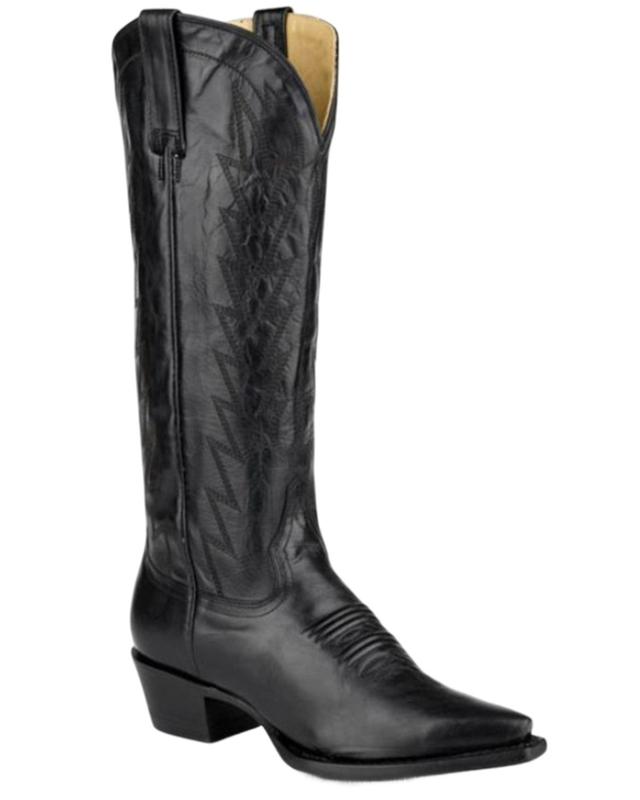 Leather upper. Snip toe. 15" shaft height. Single-stitched welt. Western heel. Leather outsole with rubber heel cap. Leather lining. Solid black design with western stitching. Handmade. Imported.