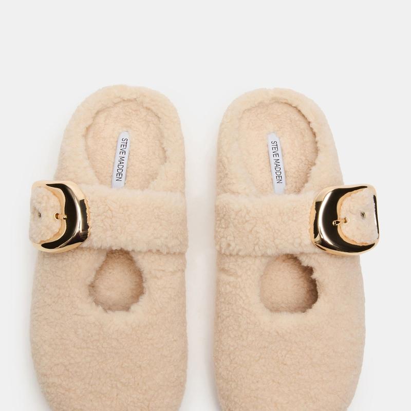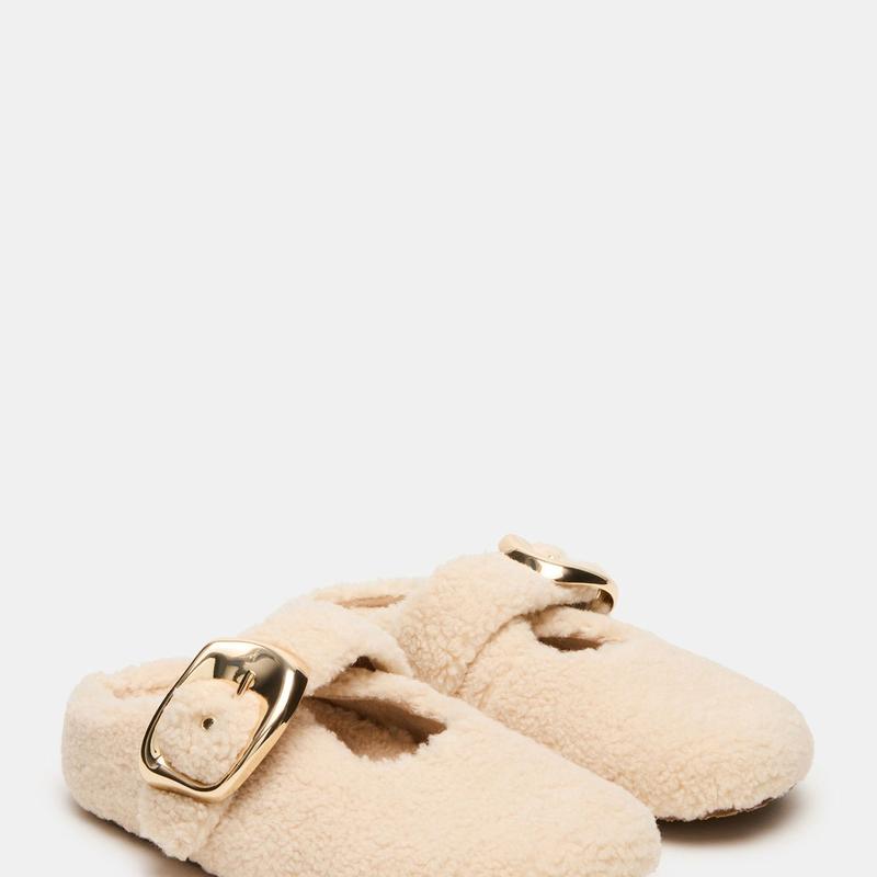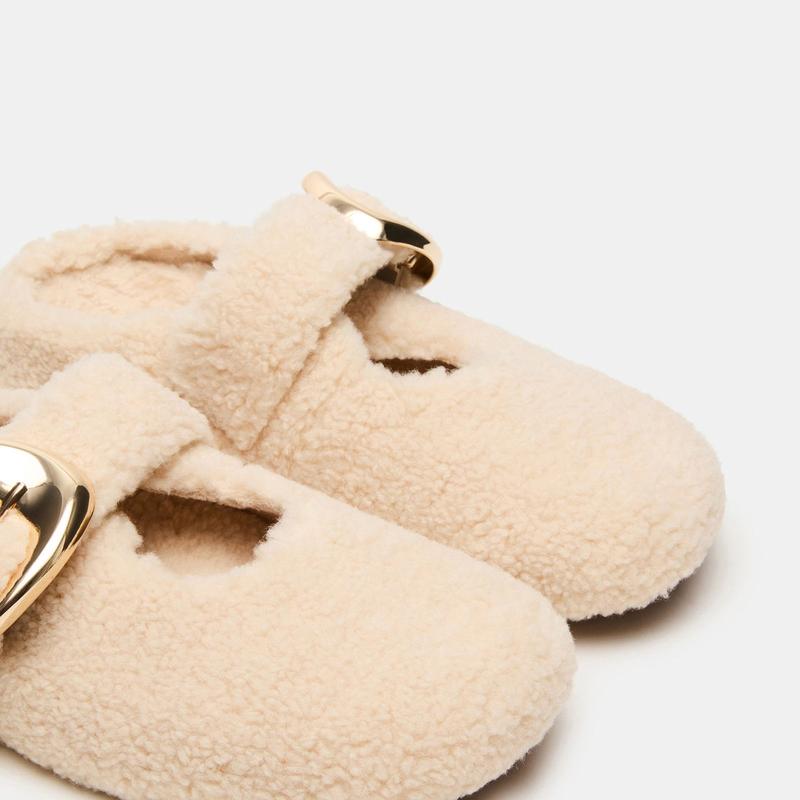 The CLOUDY NATURAL flat combines classic mule design with modern comfort. Featuring a rounded toe and a chic gold buckle detail, this slip-on style is crafted with soft faux fur for a plush, comfy feel. Ideal for those seeking effortless elegance, it offers both style and ease for everyday wear.