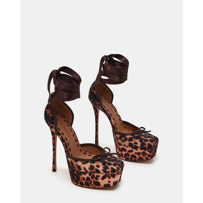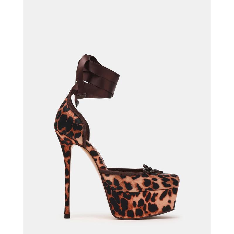 Elevate your style with the LISTEN LEOPARD SATIN heels, featuring a platform sole and delicate strappy lace-up design inspired by classic ballet shoes. Crafted to provide both elegance and stability, these heels enhance your silhouette while ensuring confident wear. Their unique finish adds a touch of luxury, making them perfect for sophisticated occasions or a standout night out.