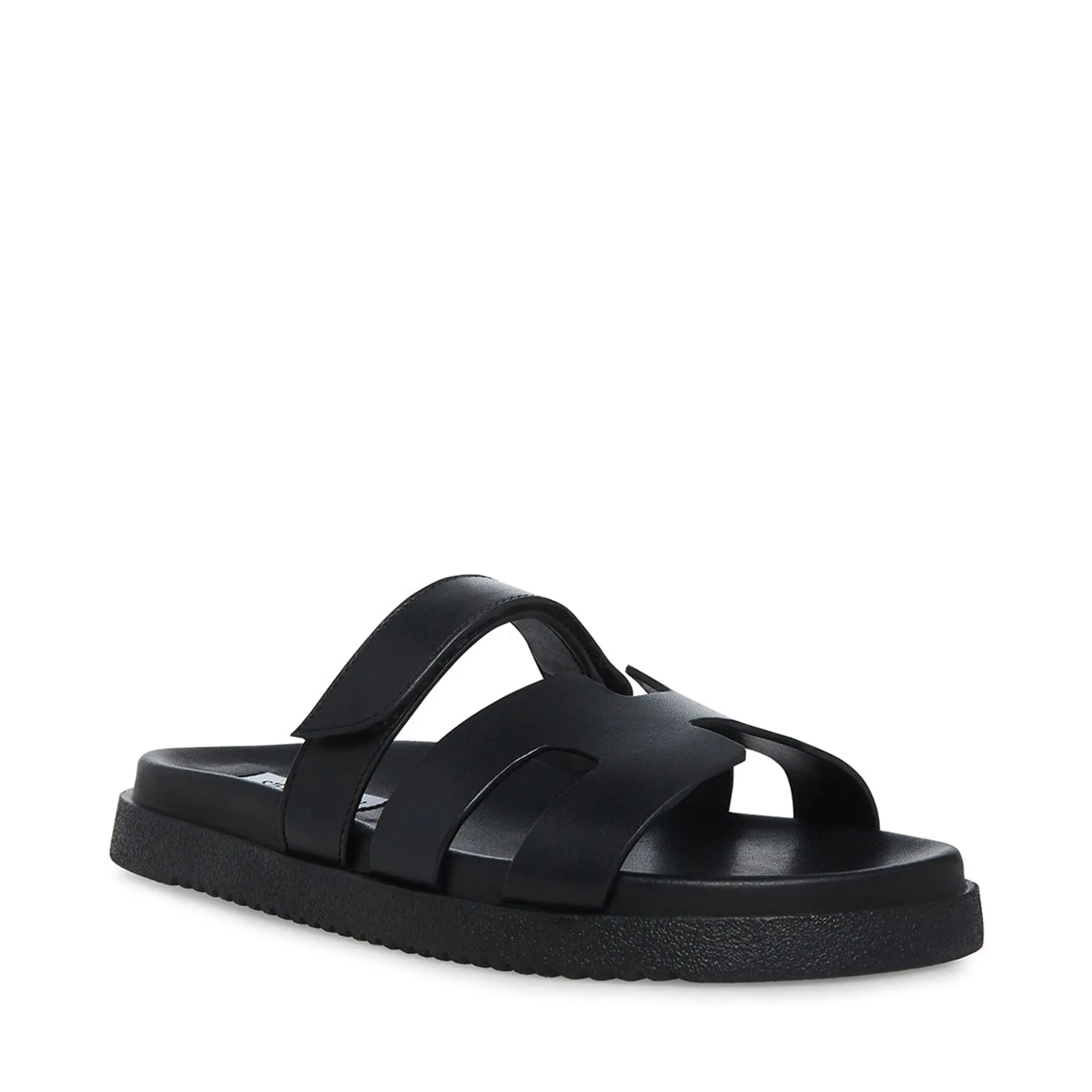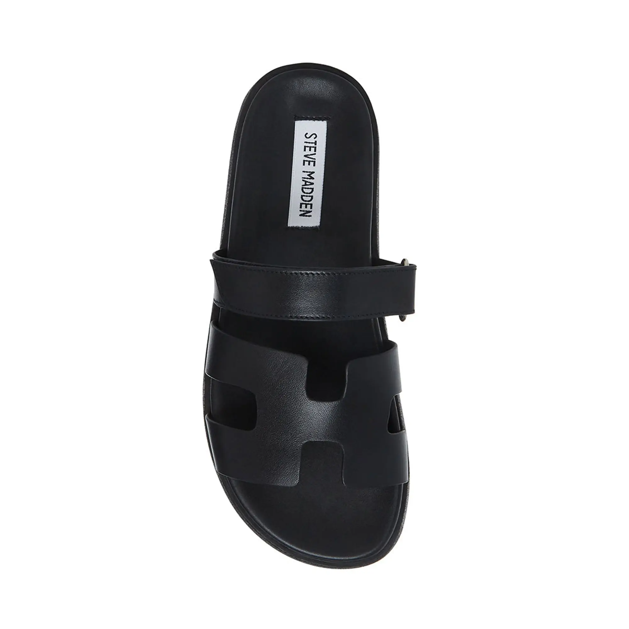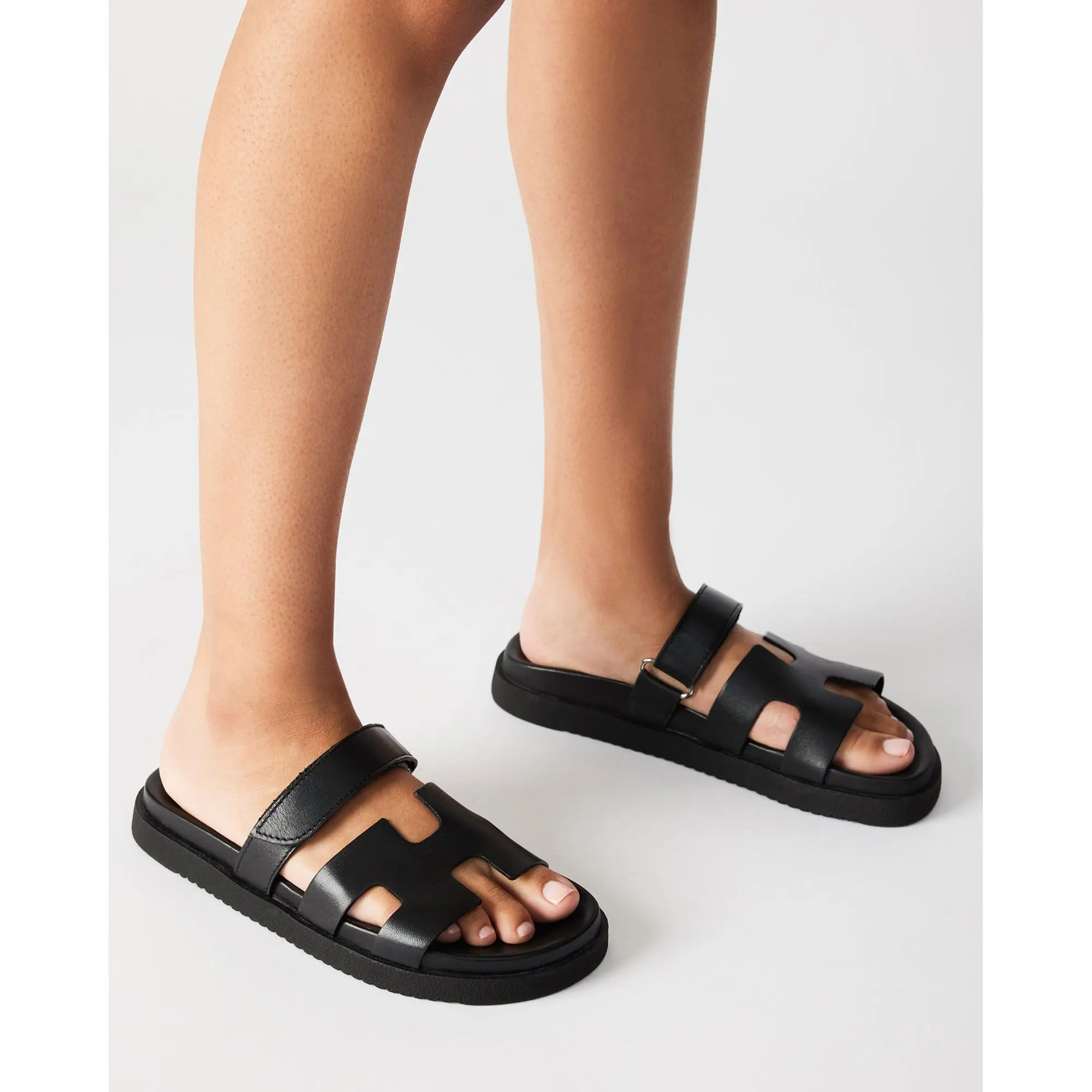 The leather MAYVEN slides feature comfy construction details like a molded footbed, a treaded flatform sole, and an adjustable top strap, plus a front strap with a geometric cutout design.