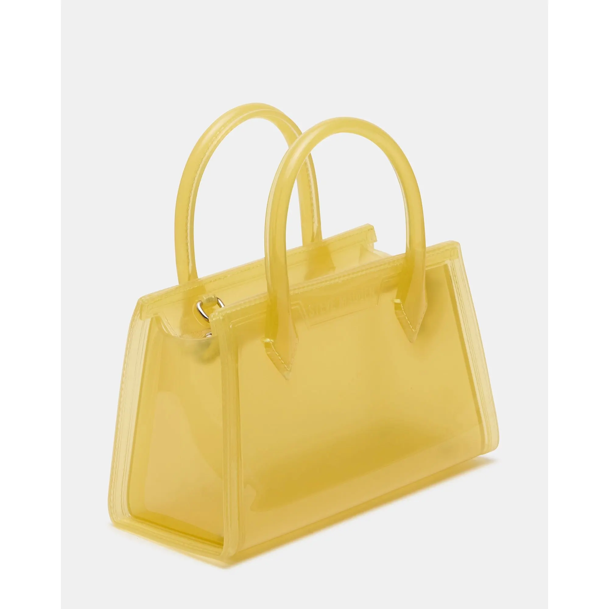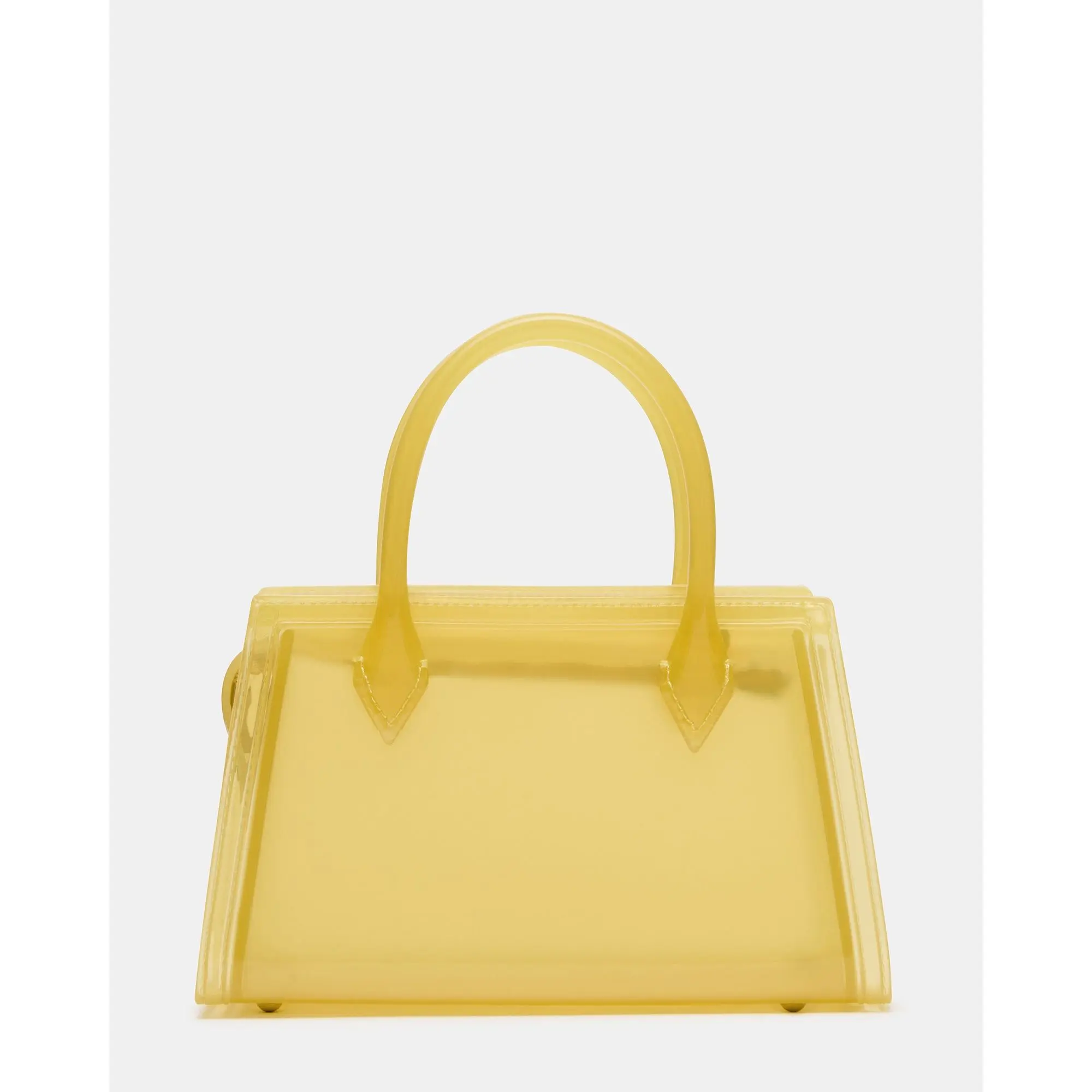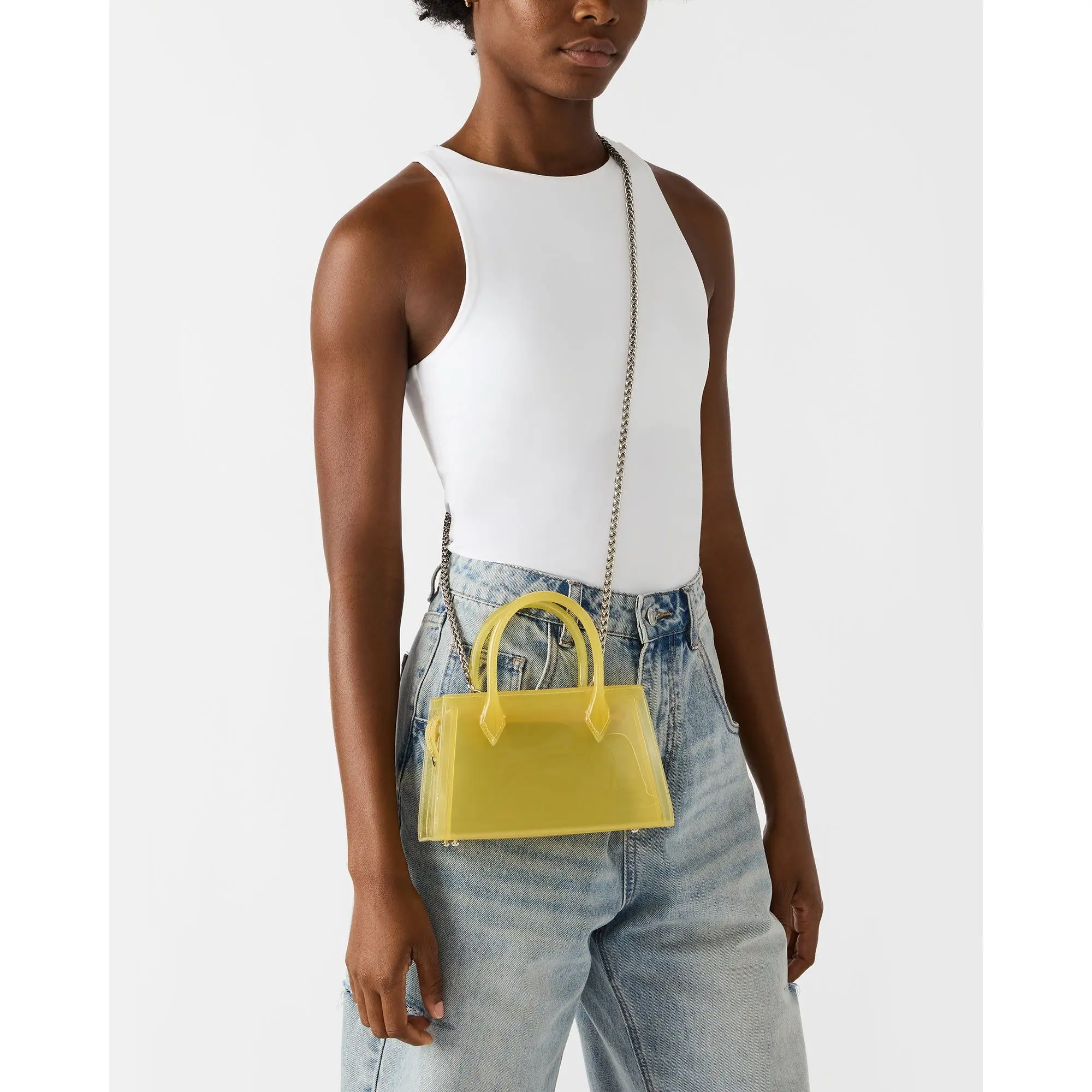 The PEACH JELLY BAG YELLOW is a contemporary essential for the modern minimalist. This compact jelly silhouette showcases a structured tubular design anchored by a refined top handle, perfect for hand-carry versatility. The removable chain crossbody strap adapts to your lifestyle, whether you prefer shoulder wear or hand-held styling. Thoughtfully proportioned to slip your phone inside with room to spare, the unlined interior eliminates unnecessary compartments for streamlined simplicity. A sophisticated accent piece that elevates any wardrobe with its bold color and architectural construction.