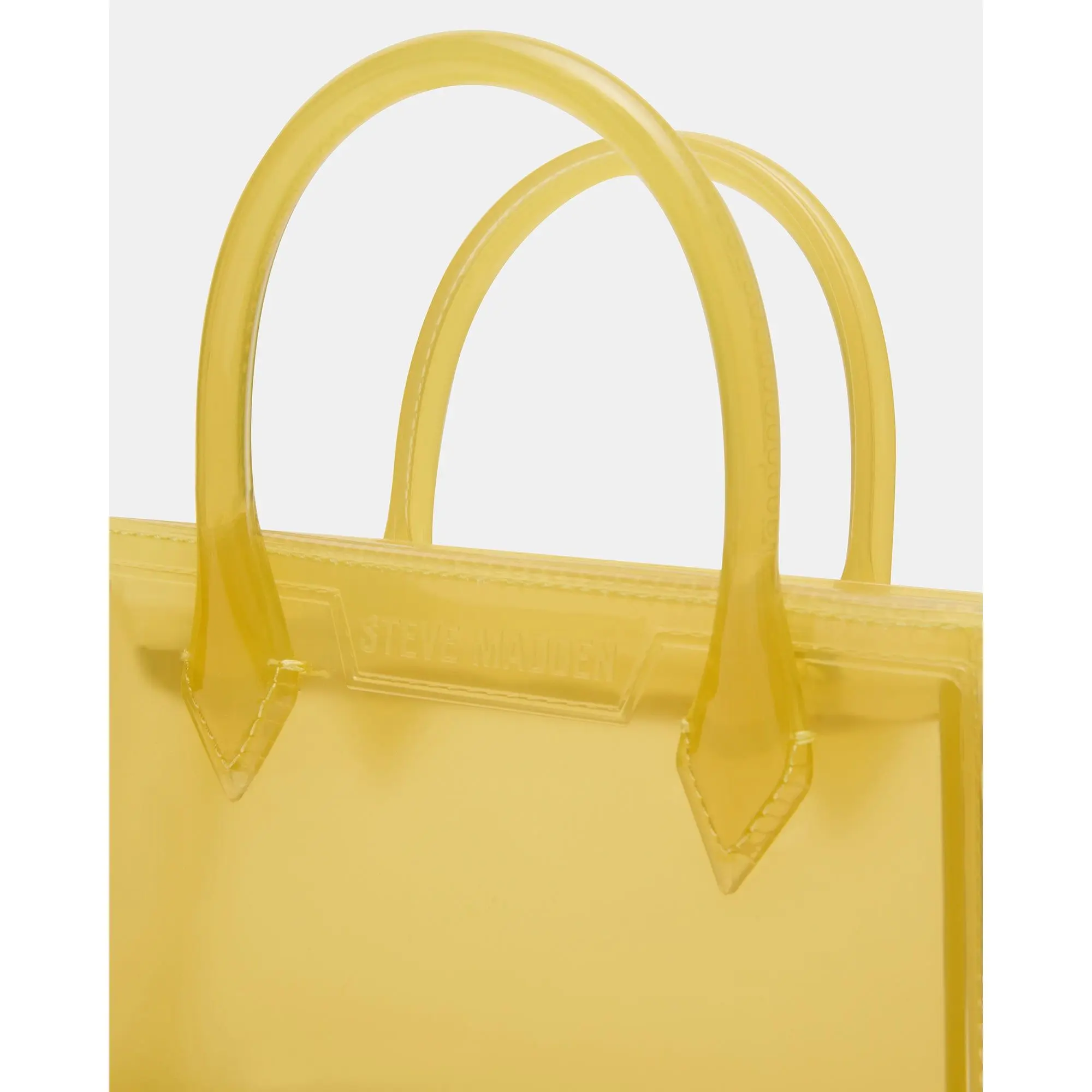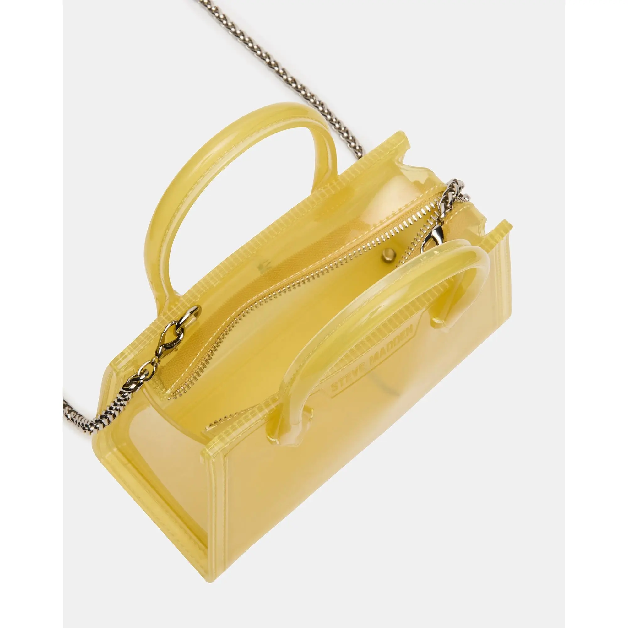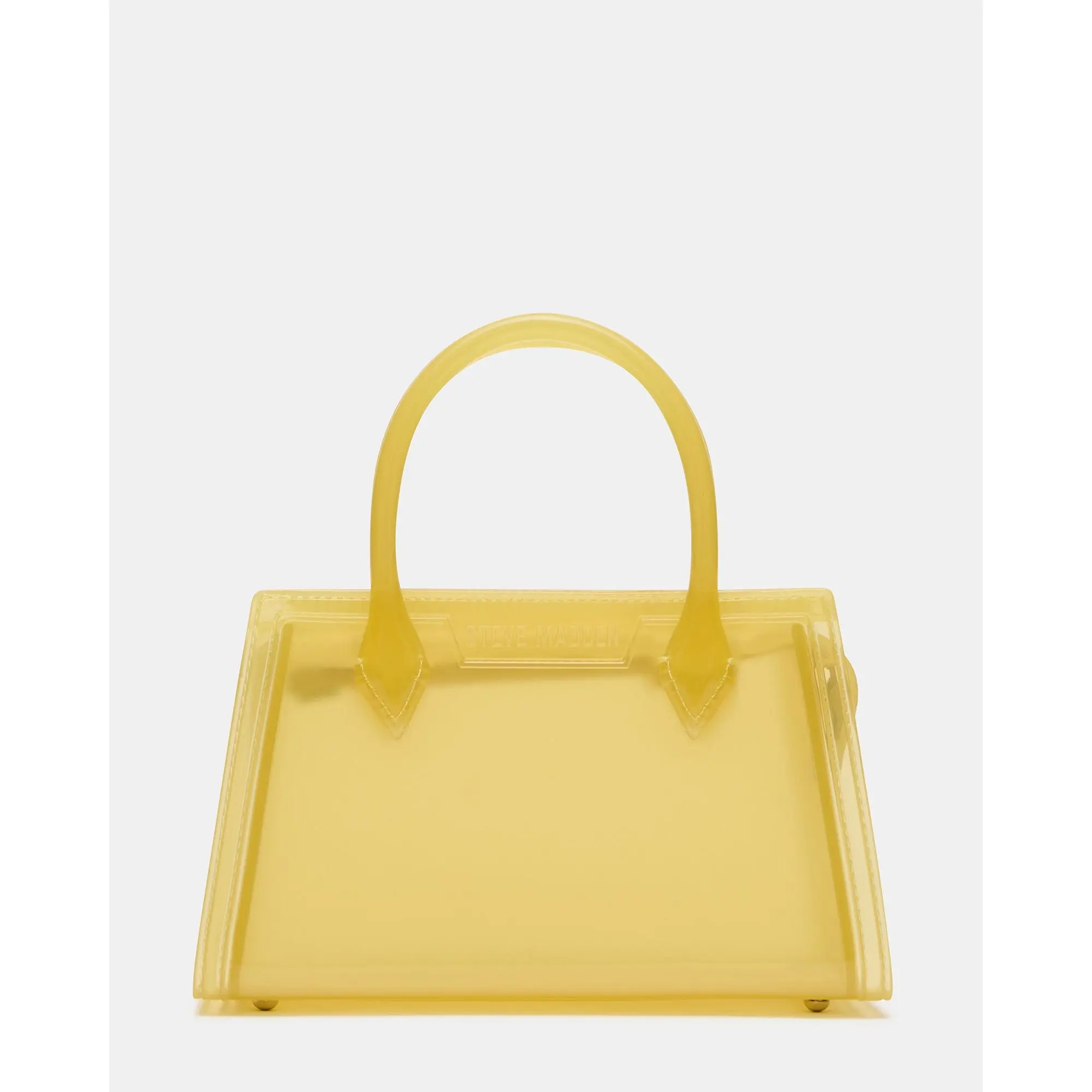 The PEACH JELLY BAG YELLOW is a contemporary essential for the modern minimalist. This compact jelly silhouette showcases a structured tubular design anchored by a refined top handle, perfect for hand-carry versatility. The removable chain crossbody strap adapts to your lifestyle, whether you prefer shoulder wear or hand-held styling. Thoughtfully proportioned to slip your phone inside with room to spare, the unlined interior eliminates unnecessary compartments for streamlined simplicity. A sophisticated accent piece that elevates any wardrobe with its bold color and architectural construction.