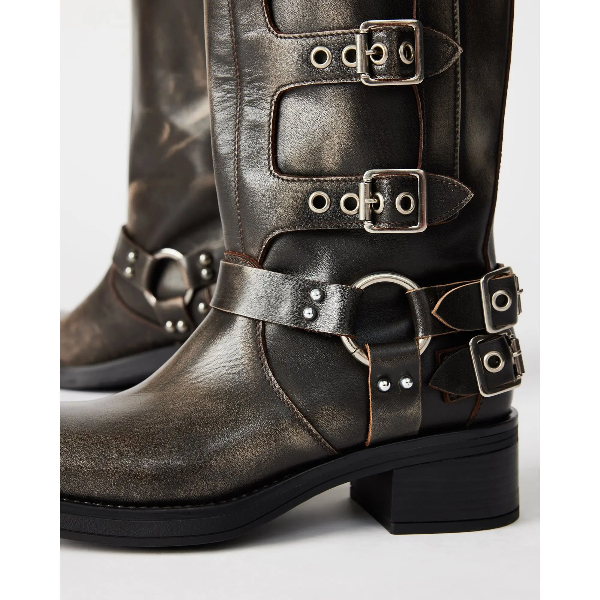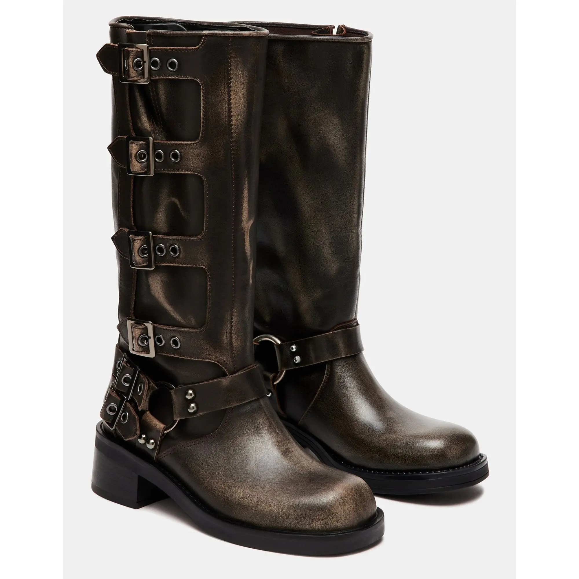 The ROCKY knee boot features the wide profile of an engineer boot with harness and buckle hardware adding an industrial edge and giving the design an adjustable fit.